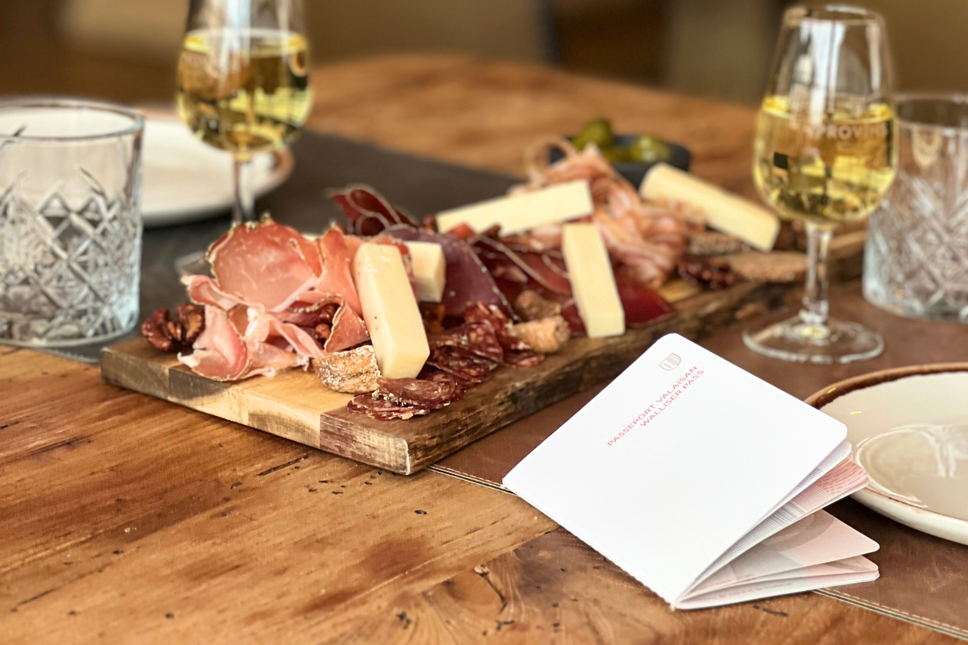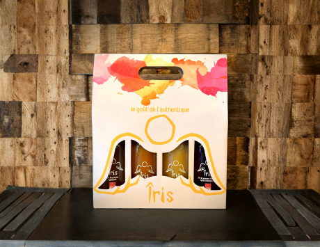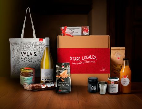 Diese Geschenkbox enthält verschiedene lokale Produkte wie Aprikosenkonfitüre und -nektar, Honig, Fruchtpaste, Croustilles de Sion, Petite Arvine, getrocknete Äpfel und Nusswurst sowie Merchandising in den Farben des Wallis – alles, was es für einen gelungenen Apéro braucht.