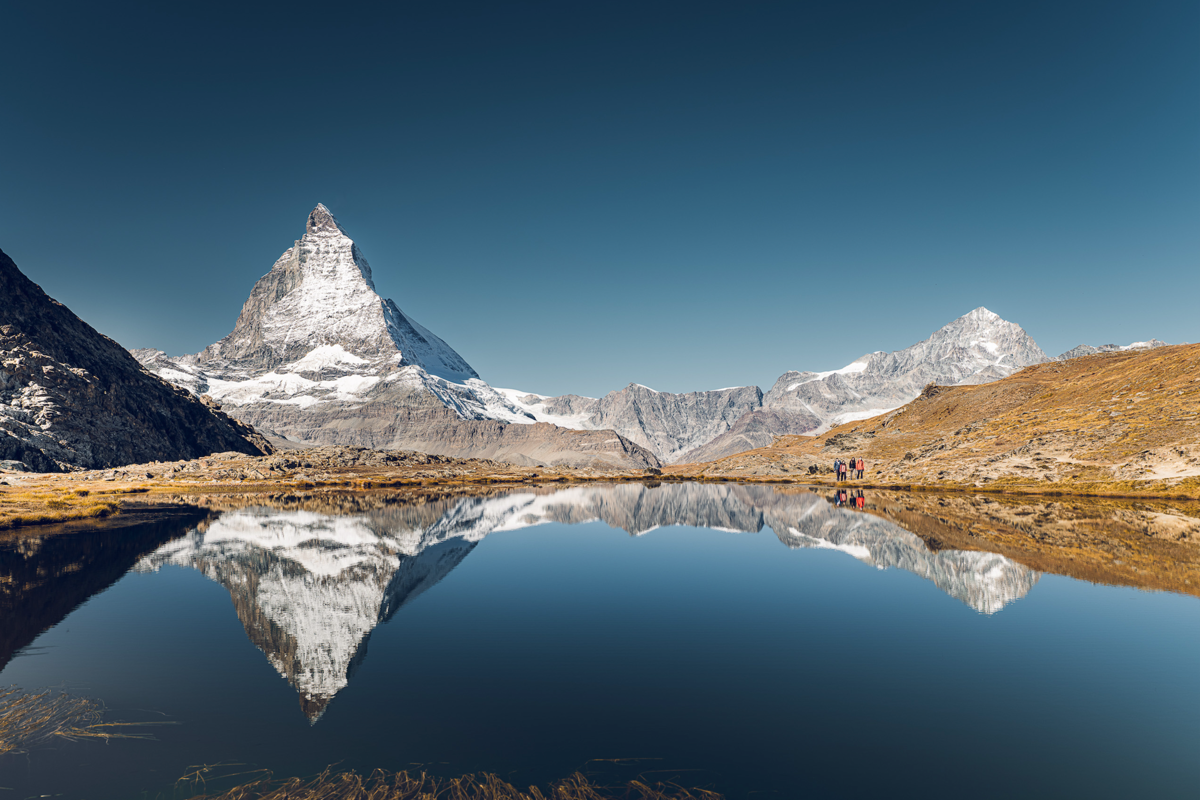 Nach einem ungefähr 10-minütigen Fussmarsch von den Station Rotenboden (unterhalb des Gornergrats) entfernt, im Naturschutzgebiet, können Sie die Spiegelung der imposanten Matterhorn-Ostwand im Riffelsee bewundern.