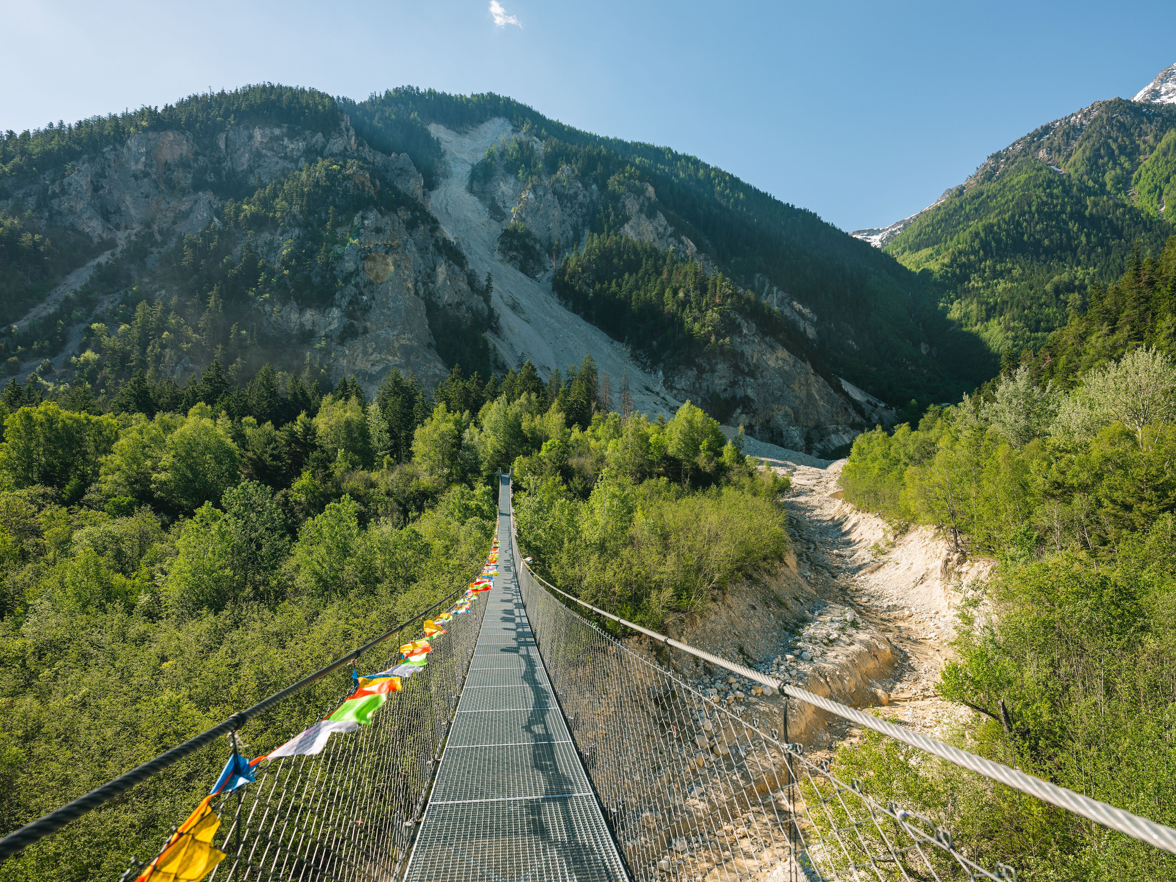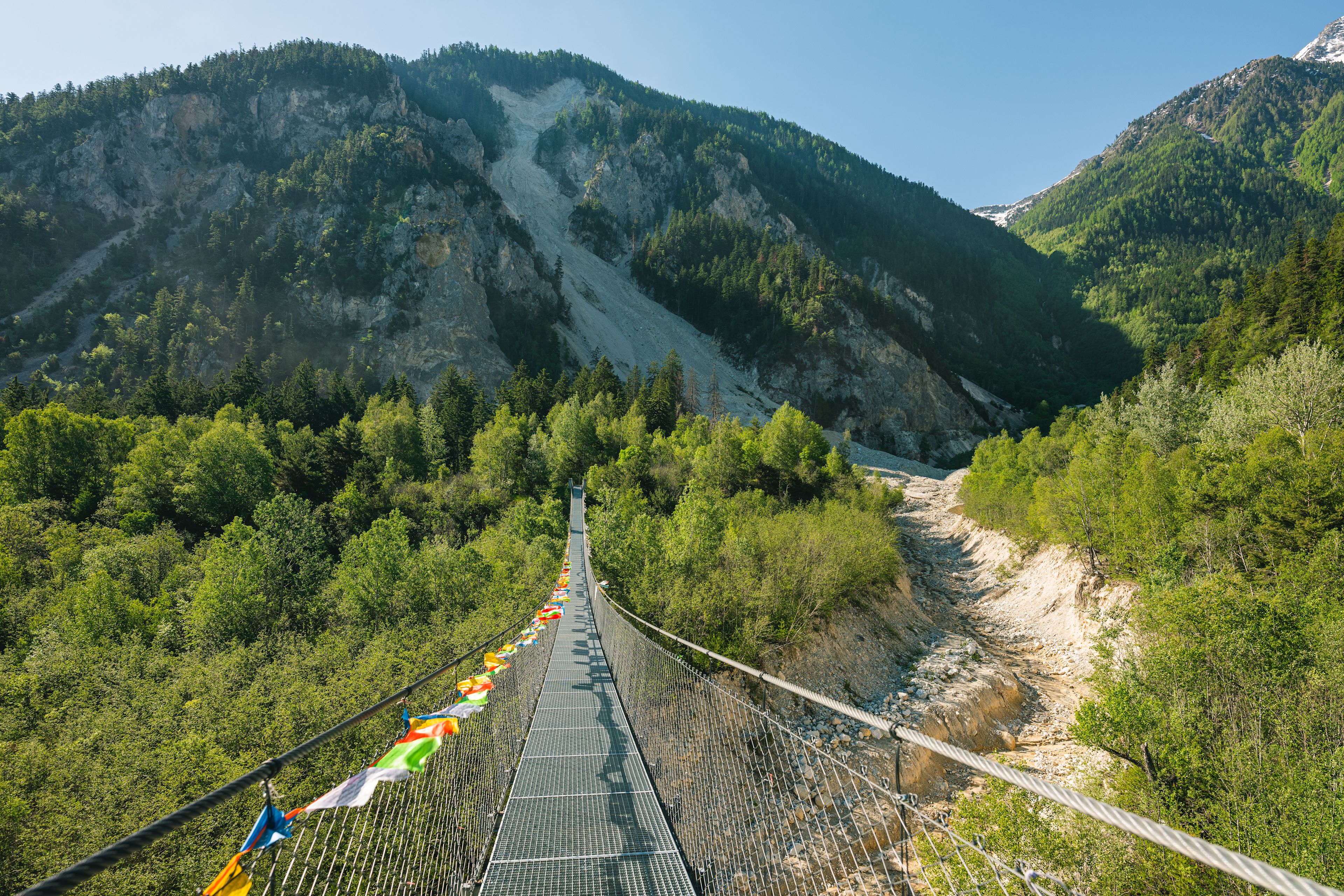 Auf einer Länge von 134 Metern überquert die Bhutanbrücke den Illgraben im Pfynwald. Die mit Gebetsfahnen drapierte Brücke bildet das Verbindungsstück zwischen dem deutschen und dem französischen Kantonsteil. Sie können sie über verschiedene Wanderwege erreichen, welche die archäologische Stätte des Illgrabens, auch Grand Canyon des Wallis genannt, durchqueren.