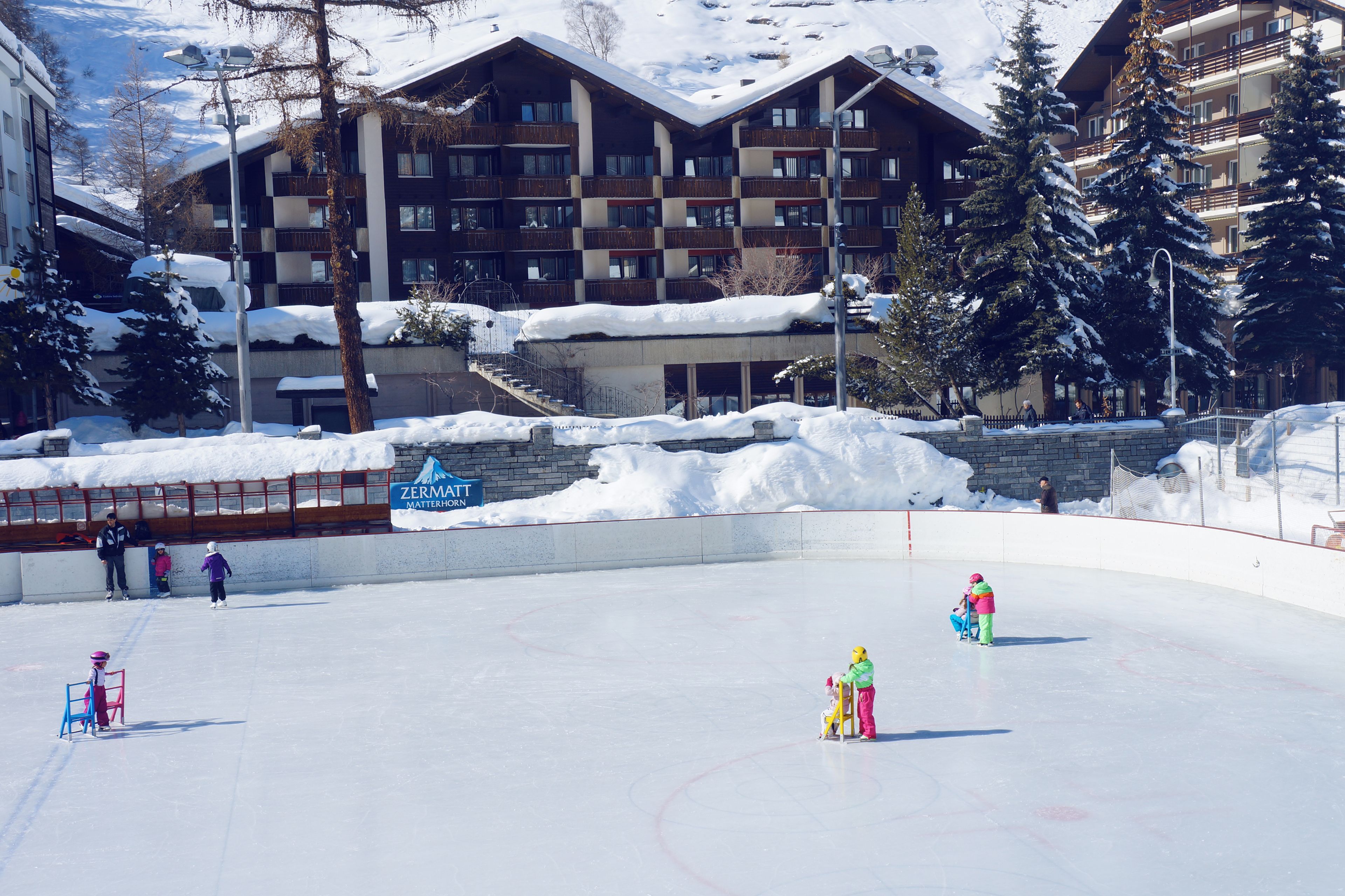 In den Sportanlagen im Dorfzentrum ist Eislaufen und Eishockey für Gross und Klein angesagt. Wenn die Kleinen auf dem Eis sind, können sich die Eltern in übersichtlicher Höhe auf die Arena-Stufen setzen und beklatschen die Pirouette und den versenkten Puck des Nachwuchses. Garderoben vorhanden, Ausrüstungen können in Sportgeschäften gemietet werden.