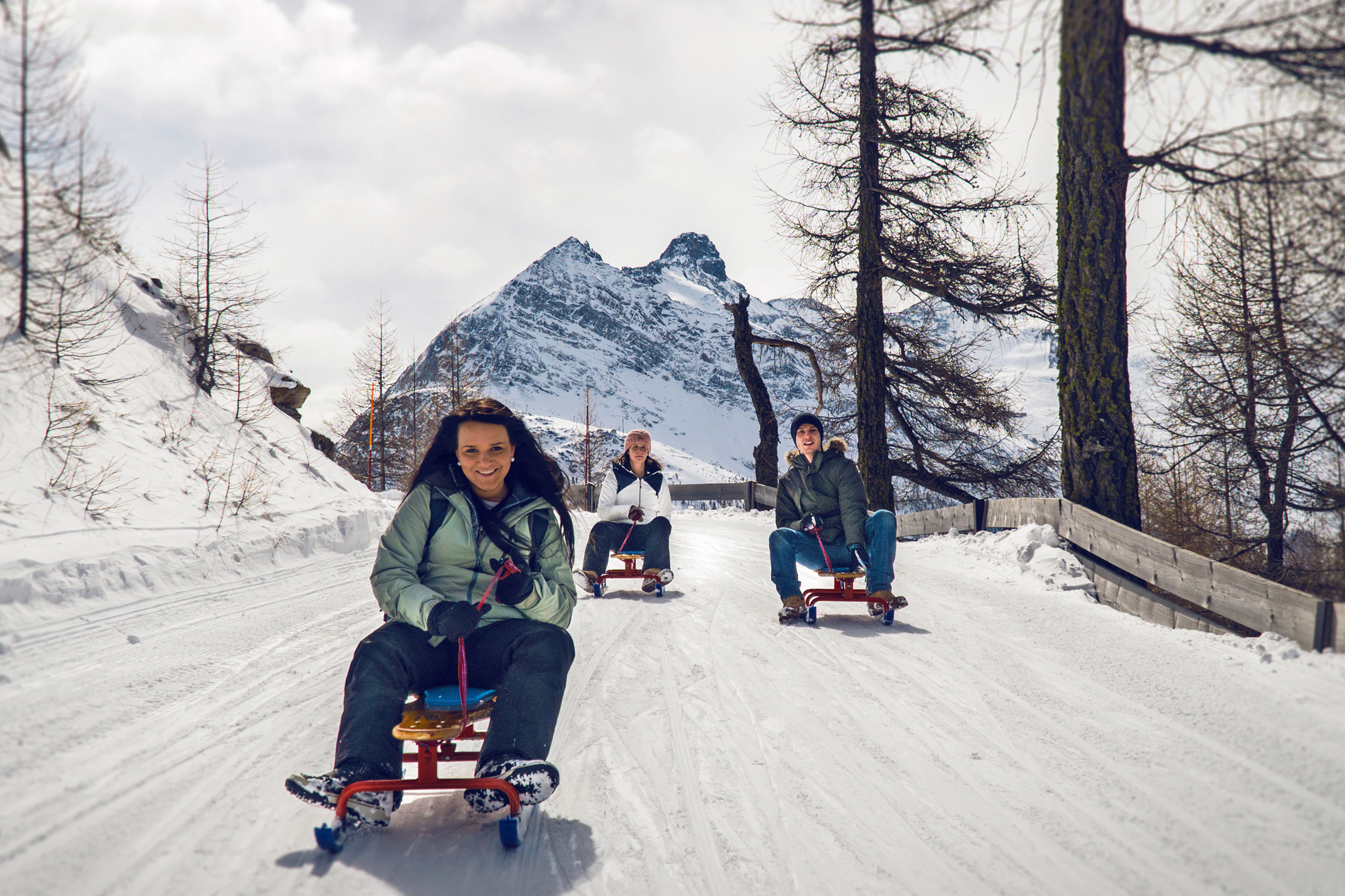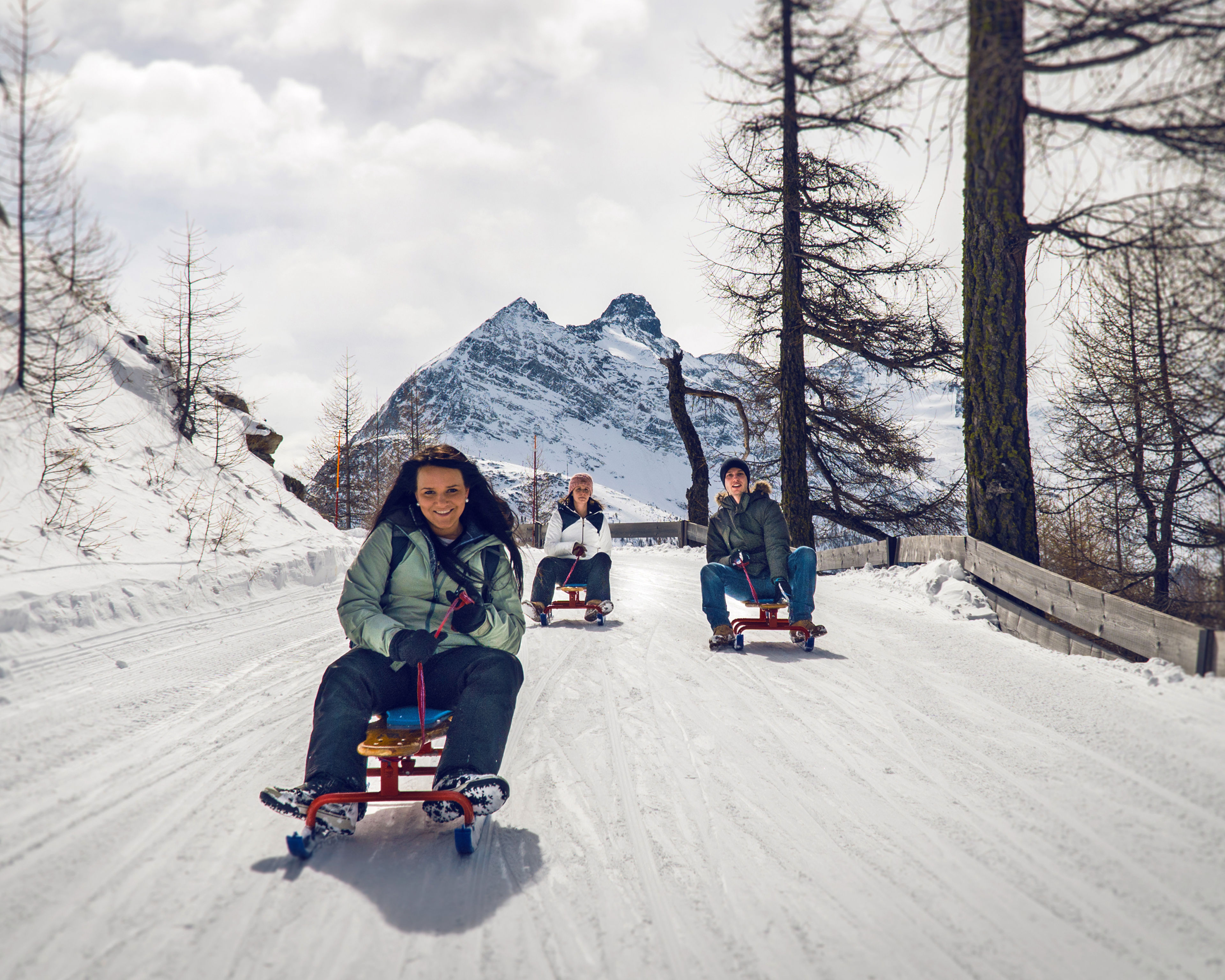 Der Schlittelweg vom Kreuzboden hinab nach Saas-Grund führt durch kleine Weiler und vorbei an Alphütten – ein rund halbstündiger und ungefährlicher Spass für die ganze Familie. Die längste Schlittelpiste im Saastal bietet einen schönen Ausblick auf die Mischabel-Gruppe. Ganze elf Kilometer lang ist die Schlittelabfahrt vom Kreuzboden nach Saas-Grund und überwindet dabei knapp 1000 Höhenmeter: ein fast endloses Vergnügen. Hinzu kommt: Die längste Schlittelpiste im Saastal ist abwechslungsreich und bietet einen schönen Ausblick auf die gegenüberliegende Bergwelt der Mischabel-Gruppe. Nach dem Start auf rund 2400 Metern über Meer, folgt schon der erste Adrenalinschub auf dem Schlitten. Denn die ersten Meter der Strecke folgen der Skipiste. Danach führt der Schlittelweg aus dem Skigebiet hinaus in einen lichten Wald. Hier passiert man die Bergbahn-Zwischenstation Trift. Diese kann als Ausgangspunkt für den Schlittelspass dienen oder es lässt sich von dort zurück auf Kreuzboden fahren, wo das Vergnügen erneut beginnen kann. Wer die Abfahrt nach Saas-Grund wählt, fährt auf einem kurvenreichen und idyllischen Weg weiter. Er führt durch kleine Weiler, an Alphütten vorbei und durch einen Lärchenwald – bis hinab zur Talstation. Während der Fahrt öffnet sich immer wieder das Panorama und bietet einen spektakulären Blick gegen Westen auf das Bergpanorama von Saas-Fee und gegen Süden auf das Mattmarkgebiet.