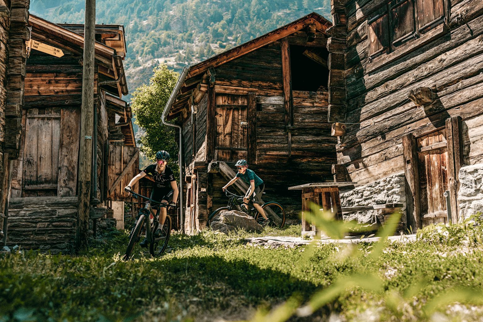 Nach ungefähr 7 Kilometern erreichen Stefanie und ihre Freundin Törbel oder Terbil, wie es die Einheimischen aussprechen. Mit seinen über Jahrhunderte von der Sonne geschwärzten Holzhäusern ist es eines der seltenen unverfälschten Walliser Bergdörfer. Um in die vergangenen Zeiten einzutauchen, lassen die zwei ihre Bikes kurz stehen und begeben sich zu Fuss durch die engen und steilen Gassen. Die typischen Walliser Stadel, eine Mühle und ein Backhaus geben einen Einblick in den einstigen Lebensalltag in einem Walliser Bergdorf.