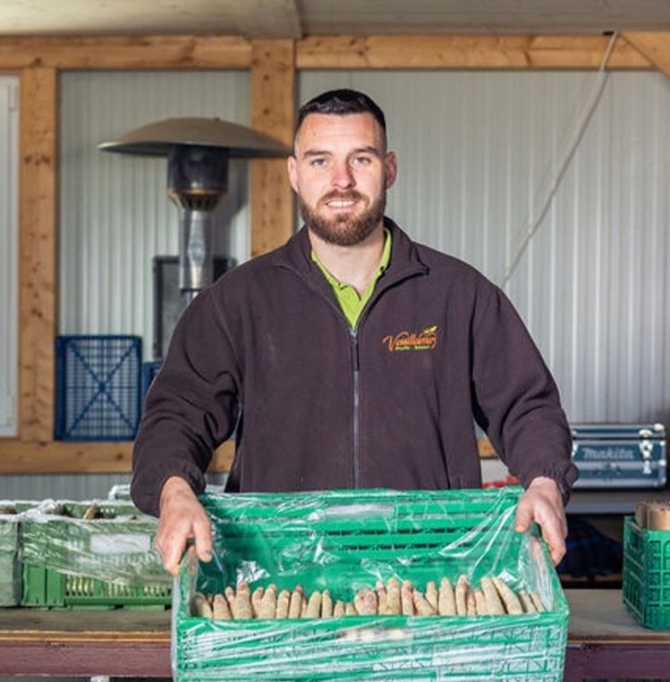 Ä isch zääni. Di Christine verzellt am Märt de Liit va iru Produkt. Schpargle, Tomat, Radiislini, Äärberr, Äämrich.