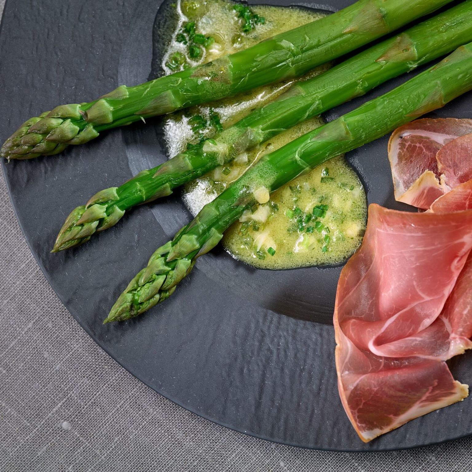 Die Spargeln schälen und auf ein mit Backpapier ausgelegtes Backblech legen. Mit Olivenöl beträufeln und mit Salz und Pfeffer würzen. 10 bis 15 Minuten oder bis die Spargeln weich sind kochen.