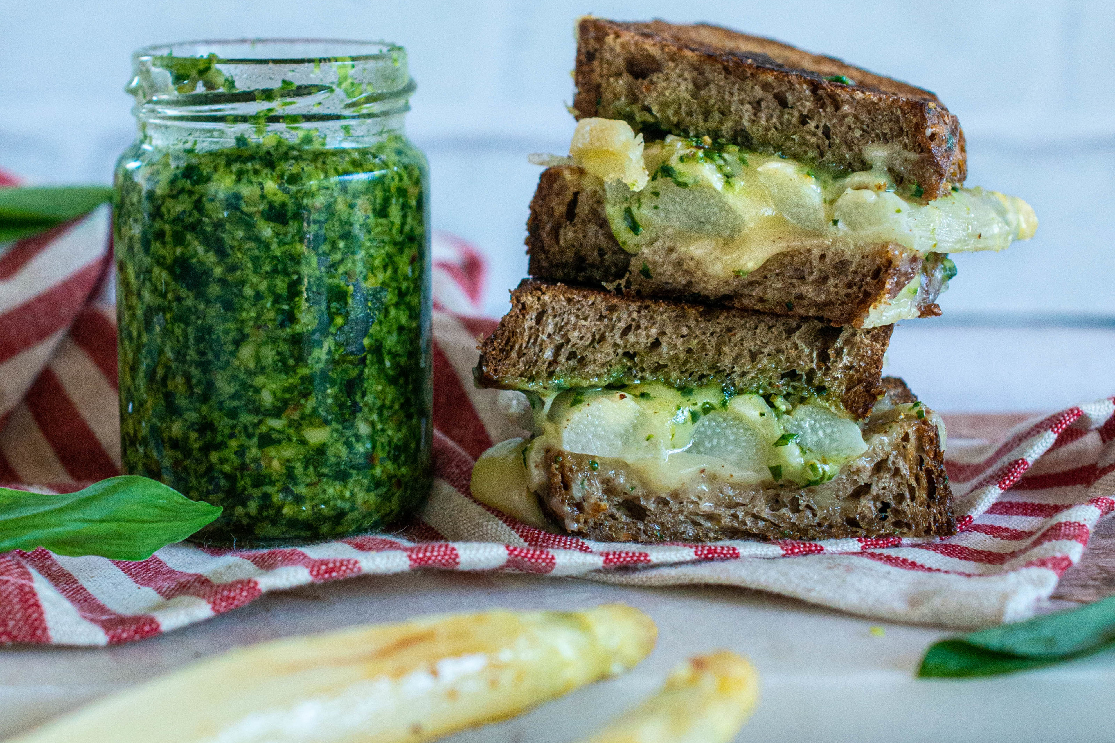 Vier Brotscheiben mit dem Bärlauchpesto bestreichen. Die anderen vier Brotscheiben mit Käse und einigen Spargeln obendrauf belegen. Das Pesto-Brot mit der bestrichenen Seite nach unten darauflegen.