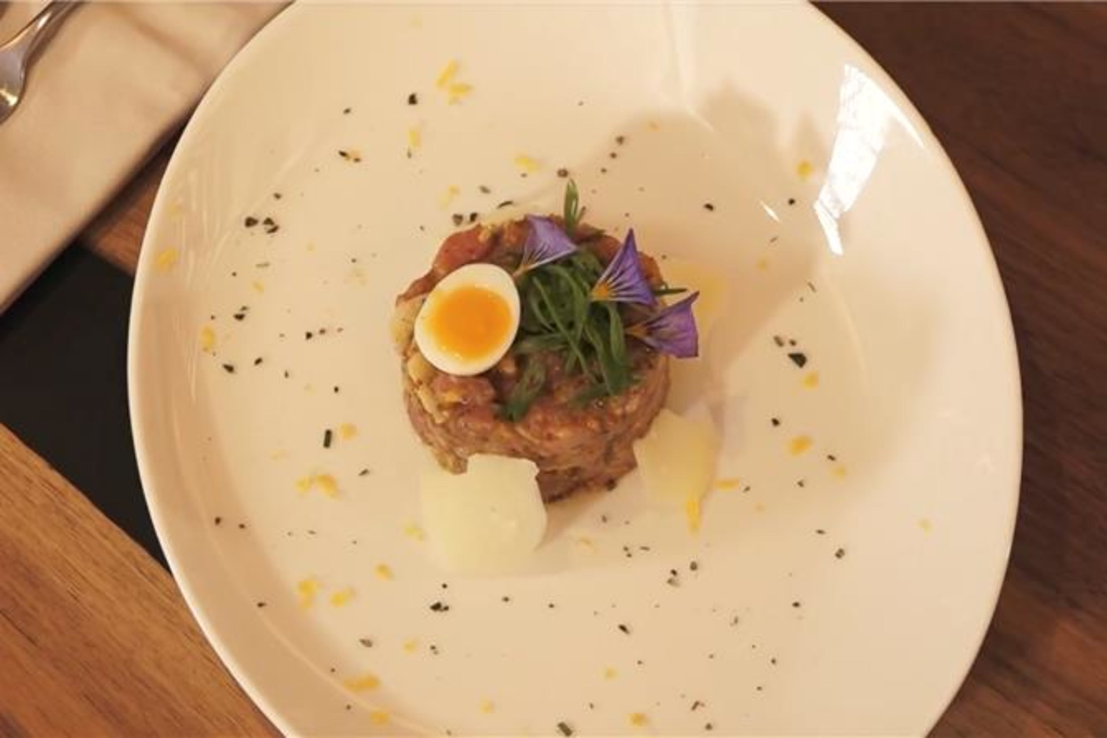 Zur Tatar passt ein weichgekochtes Wachtelei. Dieses 2 Min. in siedendem Wasser gekocht und in Eiswasser abgekühlt lassen.