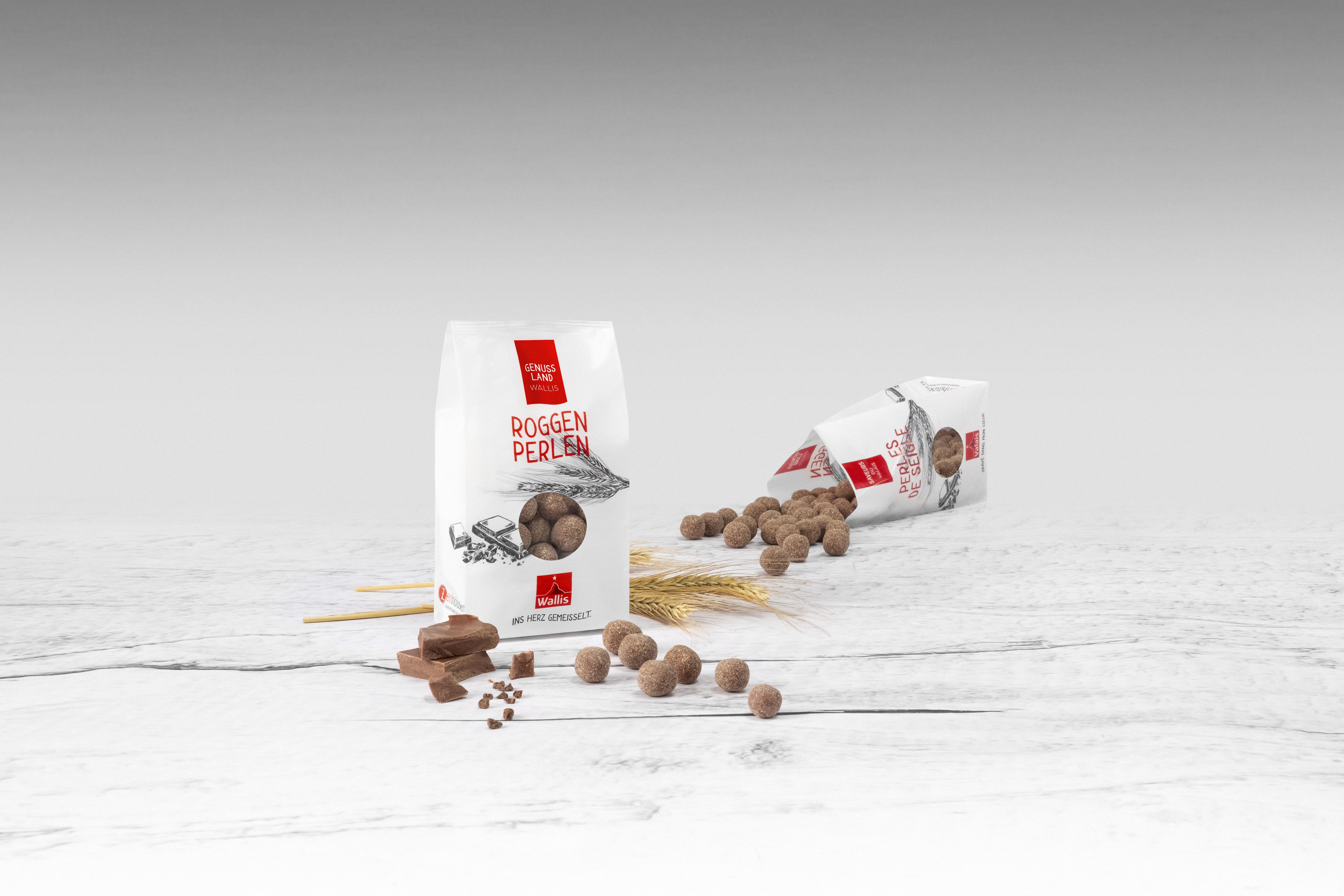 Roggenperlen der Marke Wallis sind mit feiner Milchschokolade überzogene Roggenschaumkügelchen – leichte, knusprige, zart-schmelzende Köstlichkeiten der besonderen Art. Anstoss zur Kreation dieser «Perlen der Natur» gab das Projekt der Vereinigung Walliser Roggenbrot AOP zur Förderung des Walliser Roggens durch die Kreation von neuen Produkten. Die Roggenperlen sind das Ergebnis der rundum gelungenen Zusammenarbeit zwischen der Marke Wallis, den Moulins de Sion und dem Bäckereiunternehmen Zenhäusern Frères SA.