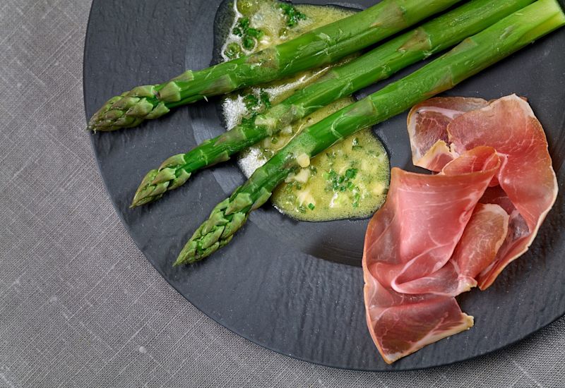 Frühlingsrezepten wie grüner Spargel mit Walliser Rohschinken IGP, herzhafte Wähe, cremiges Risotto oder einfach lauwarm mit einer hausgemachten Vinaigrette.