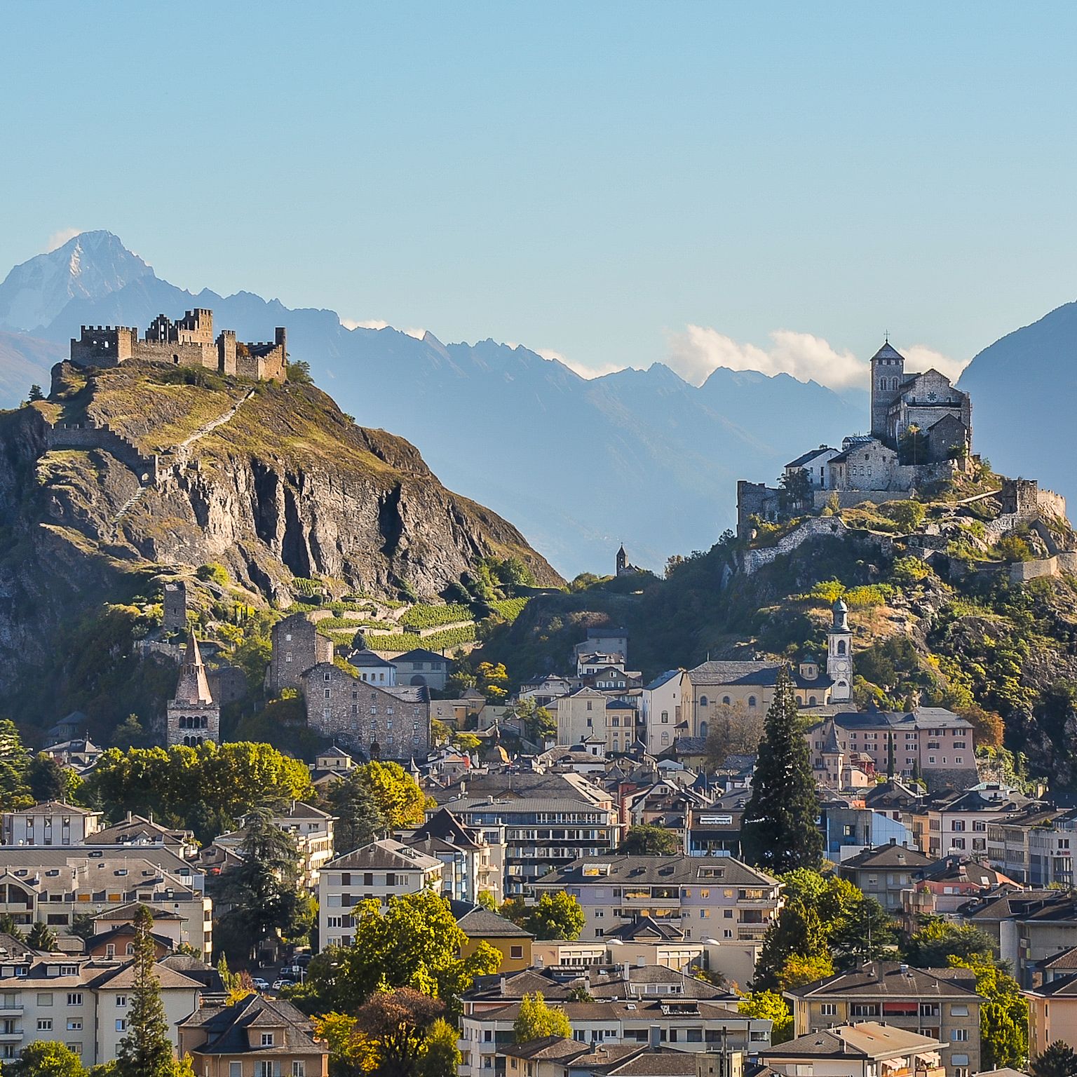 Entdecken Sie die charmante Altstadt von Sion mit ihren zahlreichen Museen, lauschigen Lokalen, ausgezeichneten Restaurants und dem malerischen Markt sowie natürlich die zwei Wahrzeichen der Stadt, die Schlösser Valère und Tourbillon.