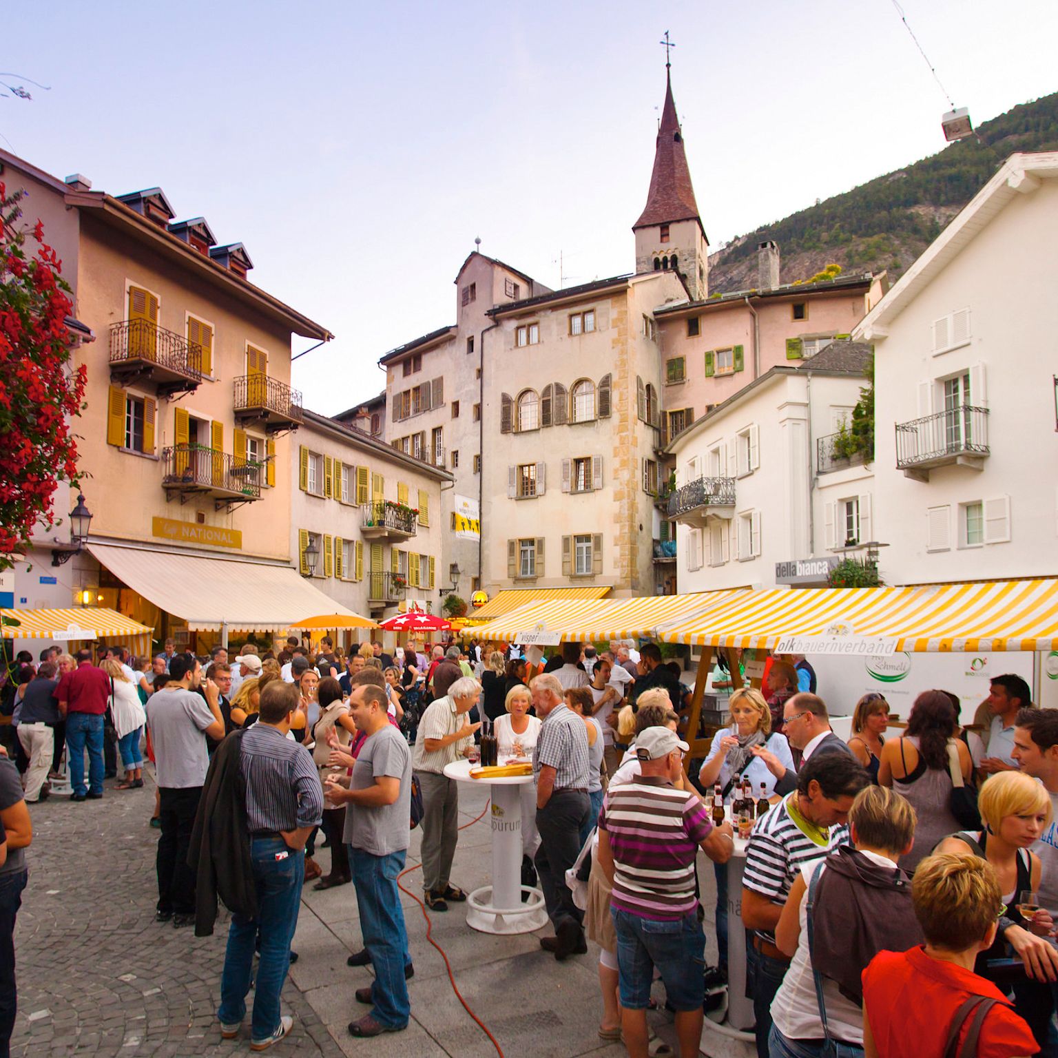 A town offering both recreational and shopping pleasures, Visp’s distinguishing feature is its La Poste cultural centre and picturesque old town with its Mediterranean atmosphere. Since the opening of the Lötschberg base tunnel, located at the starting point, this little village at the start has been perfectly developed for excursions throughout the region. Visperterminen, Unterbäch and the Moosalp region with its idyllic mountain villages of Bürchen, Törbel, Zeneggen and Embd are among the most beautiful hiking and biking paradises in the Upper Valais. The breathtaking view over the Rhône Valley warrants an excursion in its own right. Each year, Moosalp attracts crowds of visitors to its traditional Alpine festival. With its well-groomed trails, the entire mountain plateau is also a benchmark for both snow shoeing and skiing.