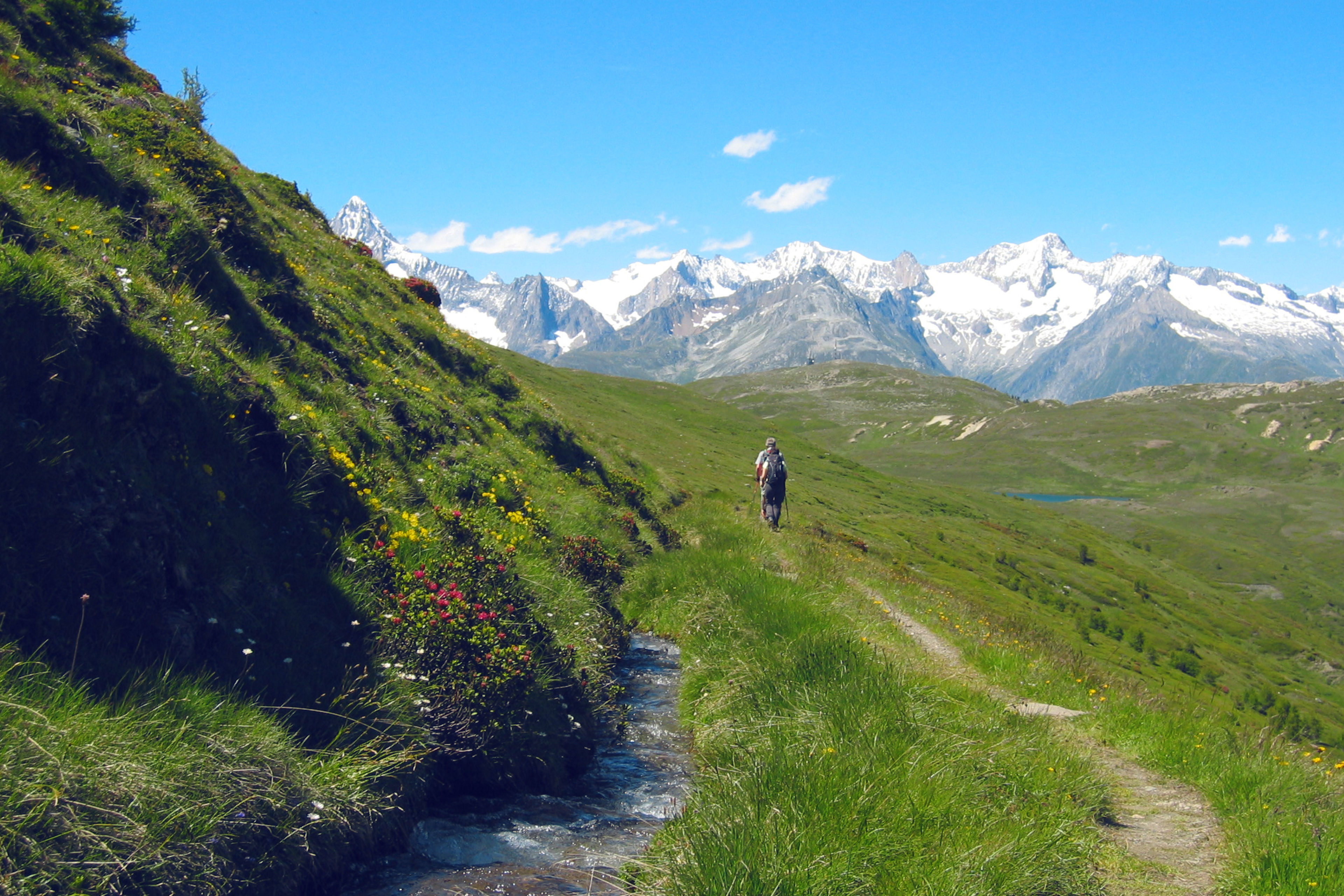 According to some historians, the name “Heido” comes from the German “Heidenleitung” (pagans’ channel), suggesting that it originated in the ancient Roman period. This irrigation channel carries its water into the meadows and vineyards of the Savagnin grape variety, used to produce the famous local Heida wine. The path along the channel forms part a trail full of history linking Giw, above Visperterminen, to the Simplon Pass – via the pastures of the pristine Nanztal valley, located at an altitude of more than 2,200 m.
