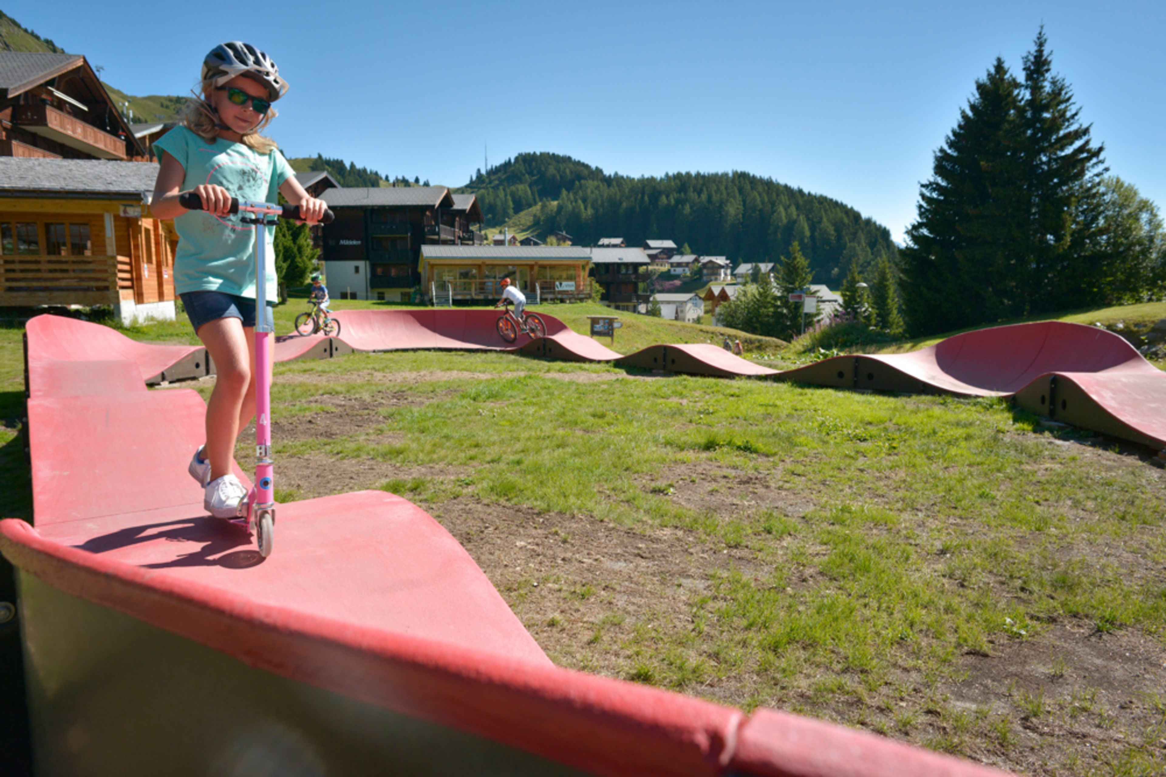 “Iische Park” is the name of the pump track on Riederalp in the Aletsch Arena. Set in a grassy area on the Alpenrose site, it is ideal for children and adults, beginners and pros alike, whether for fun or serious training. At 46 metres long and a metre wide, the fibreglass and marine plywood track is designed for bike, balance-bike and scooter riders, not to mention rollerbladers. The “Iische Park” pump track is free to use, and anyone who wants to try it out can rent a bike on the spot.