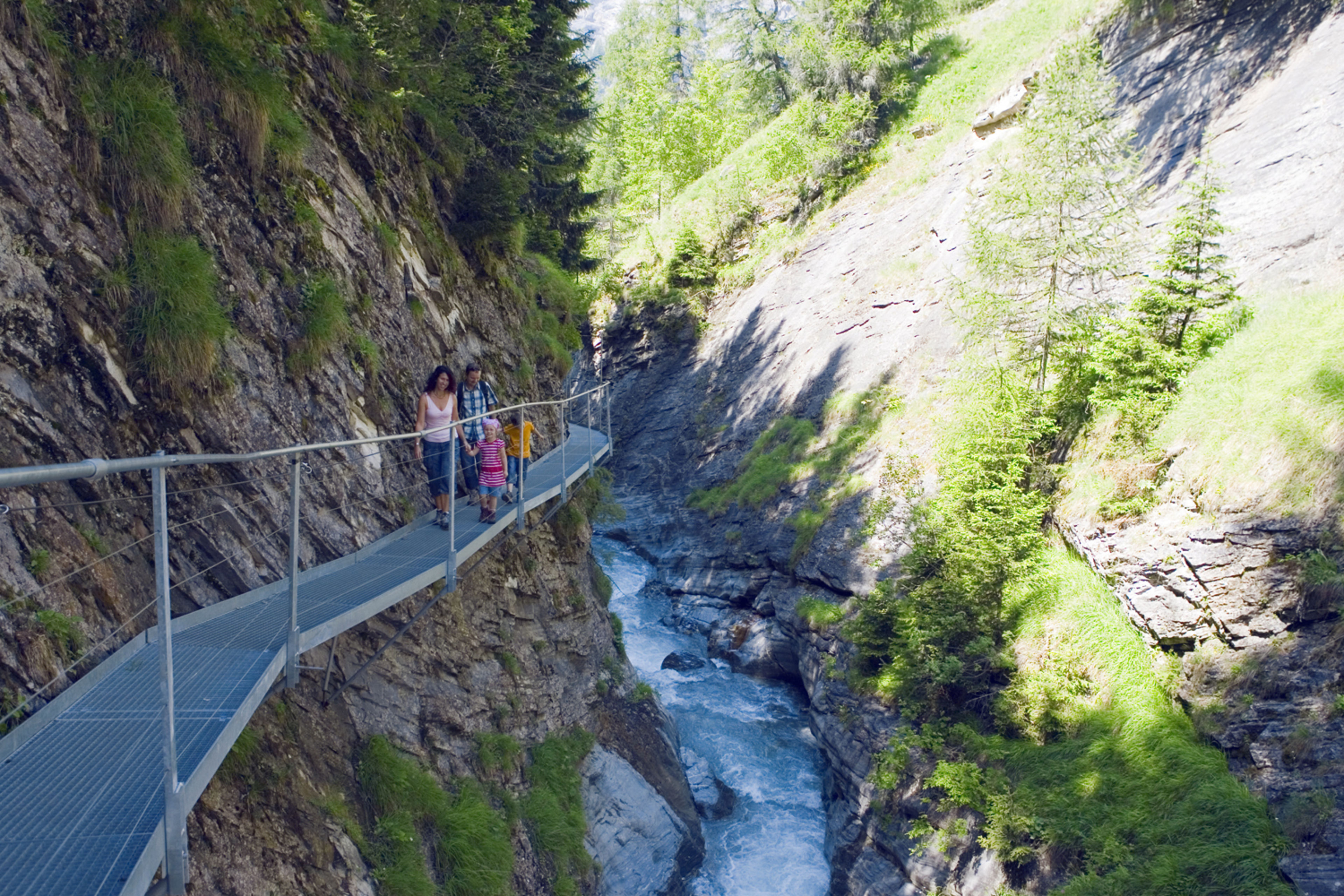 Less than one kilometre from the village square the Thermal Springs Footbridge crosses the Dala Gorge of Leukerbad. The footbridge is almost 600 metres long and stands four metres above the riverbed. The powerful waters beneath are impressively close. Brown traces of rust on the surrounding rock faces indicate that there is iron in the thermal waters. Following moss-covered cliffs, hikers cross a 21-metre-long bridge to a 35-metre-high waterfall. On the way back, you bypass the gorge on the northern or southern side to get back to the Heilbadbrücke (healing bath bridge).