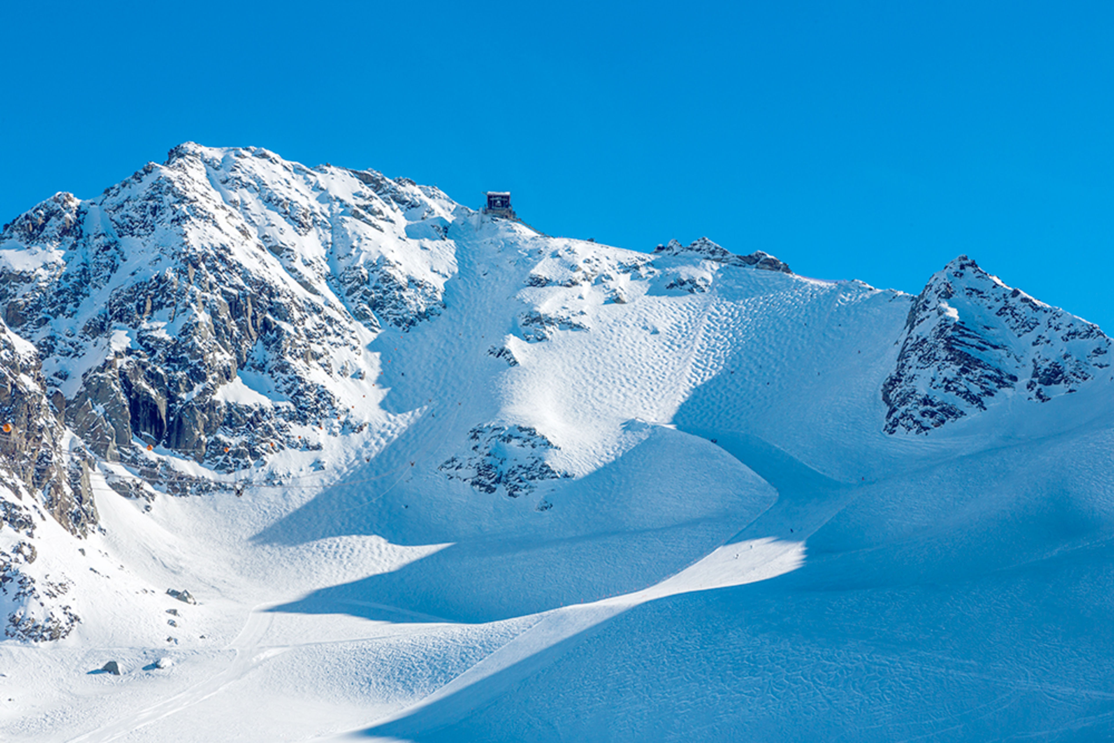 In winter as in summer, the Mont-Fort is an extremely popular excursion destination. Everyone can reach the summit thanks to the lift system. In fact, from this incredible view point the most beautiful alpine mountains, from the Matterhorn to the Mont-Blanc, reveal themselves before you. The Mont-Fort is one of the best view points in the Alps, which can be reached effortlessly. The cable car from Gentianes to Mont-Fort crosses the Tortin Glacier and in winter you can ski down on a black slope which leads over the glacier. The two main characteristics of the Mont-Fort – Gentianes – Tortin ski run are steepness of its slope and the altitude of its summit (3330m). As opposed to most ski runs, the Mont-Fort one is not prepared mechanically. The slope is too steep to allow this. The preparation is limited to securing the area around the slope after each snowfall. This particularity makes this slope the only one of its kind.