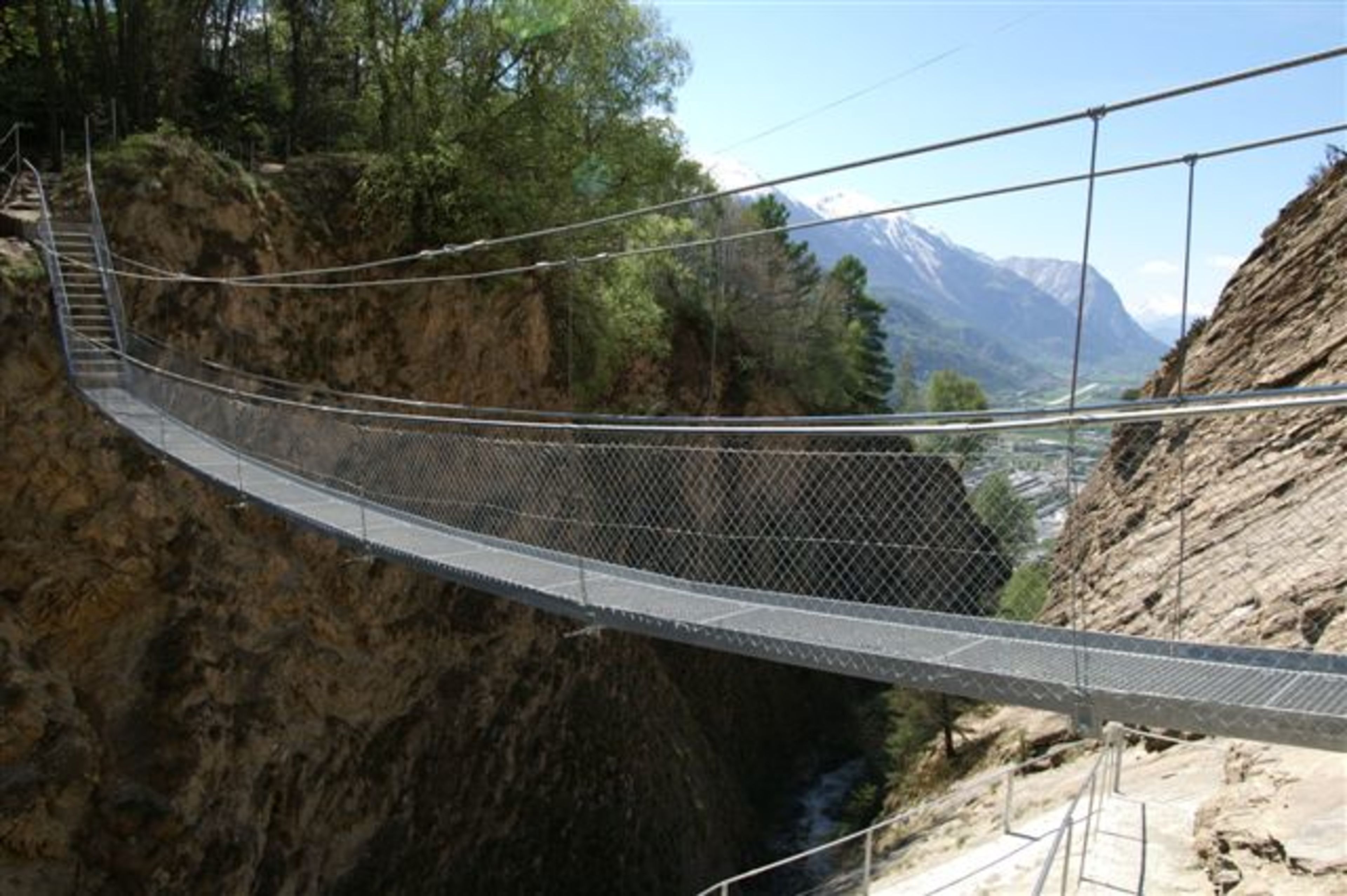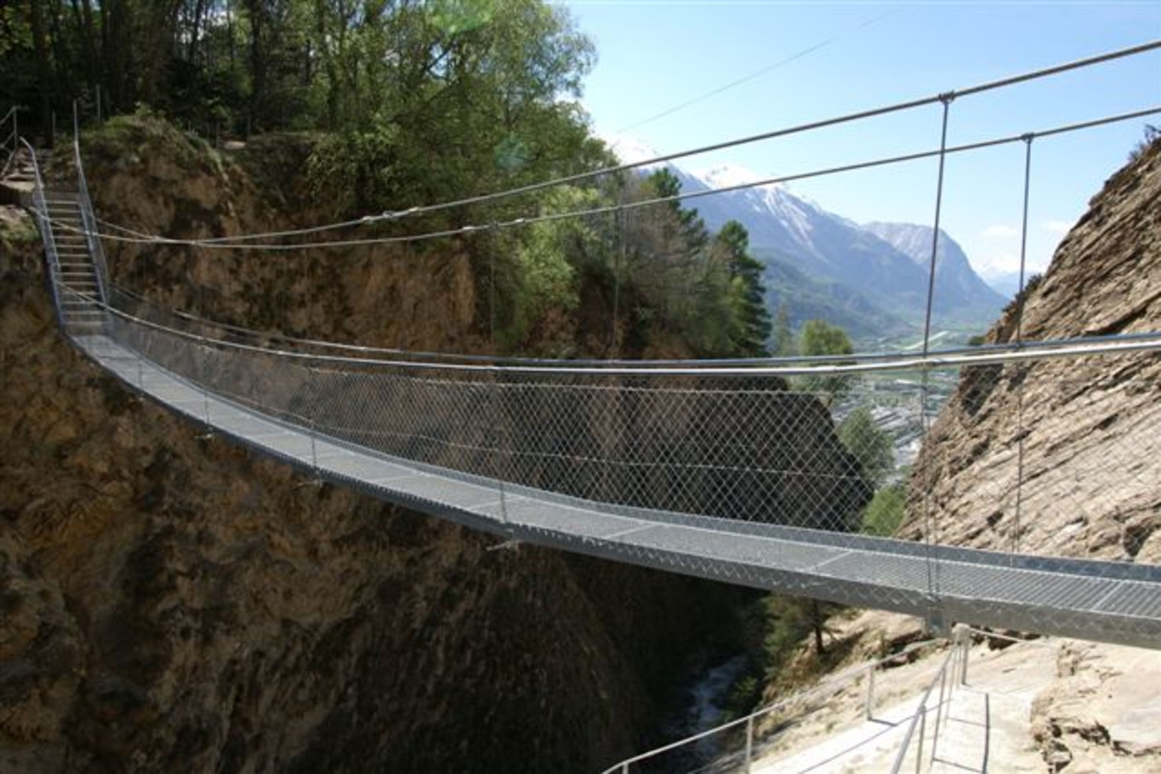The 24-metre long suspension bridge spans the wild Joli Gorge at a height of 25 metres. Built in 2005, it connects the southern ramp of the Lötschberg with the village of Niedergesteln. The footbridge is on the hiking trail that leads from Raron to Niedergesteln. The 8.7-kilometre route takes about two hours to walk up to the footbridge and then half an hour to reach the village of Niedergesteln.