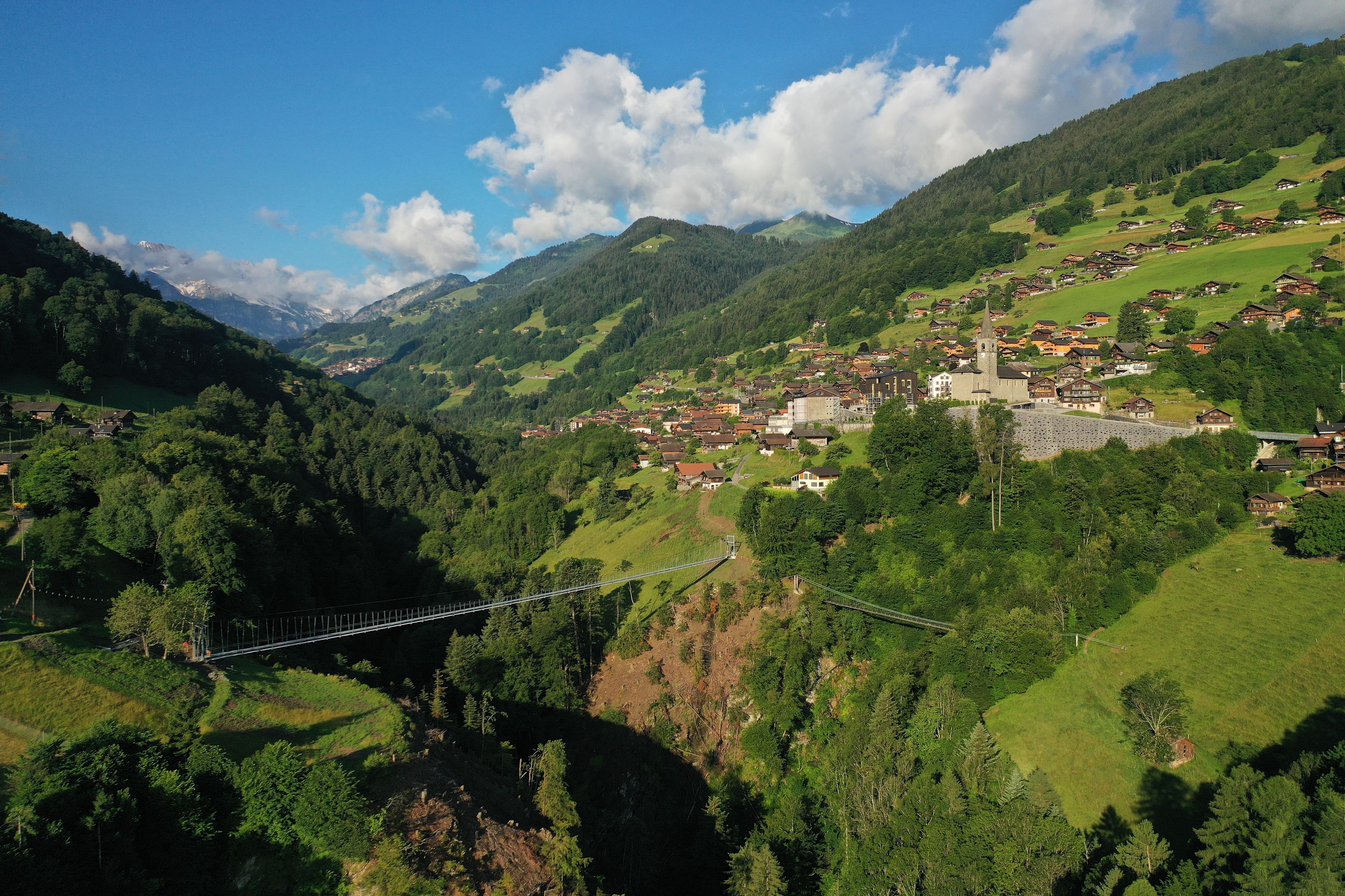 With a length of 185 metres and a height of 75 metres, this footbridge provides a new soft mobility route and secures the drinking water supply of the Chenarlier district. Access: On the village side of Troistorrents: parking of the Tine (under the church), the access to the footbridge is just in front of the Galerie de la Tine, go down to the left the pedestrian path covered with wood chips.