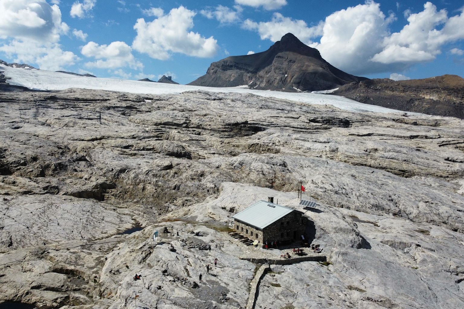 This mountain hut is located in an idyllic landscape at 2,831 m above sea level, between two small lakes and in front of the eponymous glacier. It is open year-round, but only staffed during the summer.
