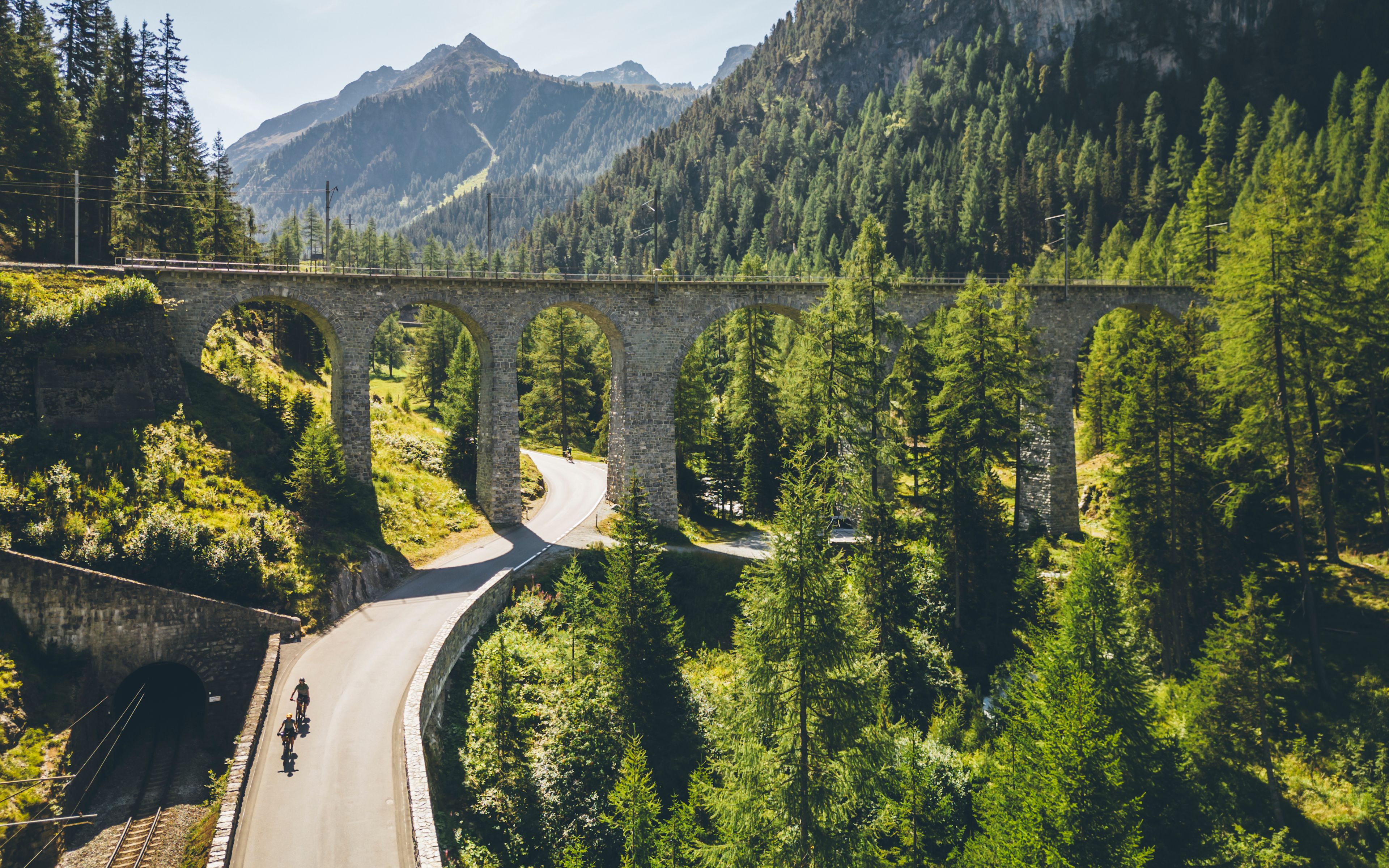 The bike adventure begins in Switzerland’s largest canton, Graubünden – more precisely in the idyllic Engadine high valley. St. Moritz lies at one extreme of the historic Glacier Express railway line that provided the inspiration for the Glacier Bike Tour. By combining up to 10 stages, keen cyclists can experience the region’s diversity up close and personal. The initial section is extremely impressive, following the historic Albula railway line, a UNESCO World Heritage Site. The line, which opened in 1903, is evidence of a truly pioneering spirit. It links St. Moritz and Thusis, via total of 144 bridges, 42 tunnels and galleries. Viewed from the cycle path, it also proves to be a real attraction and opens up fascinating new perspectives on the art of engineering.