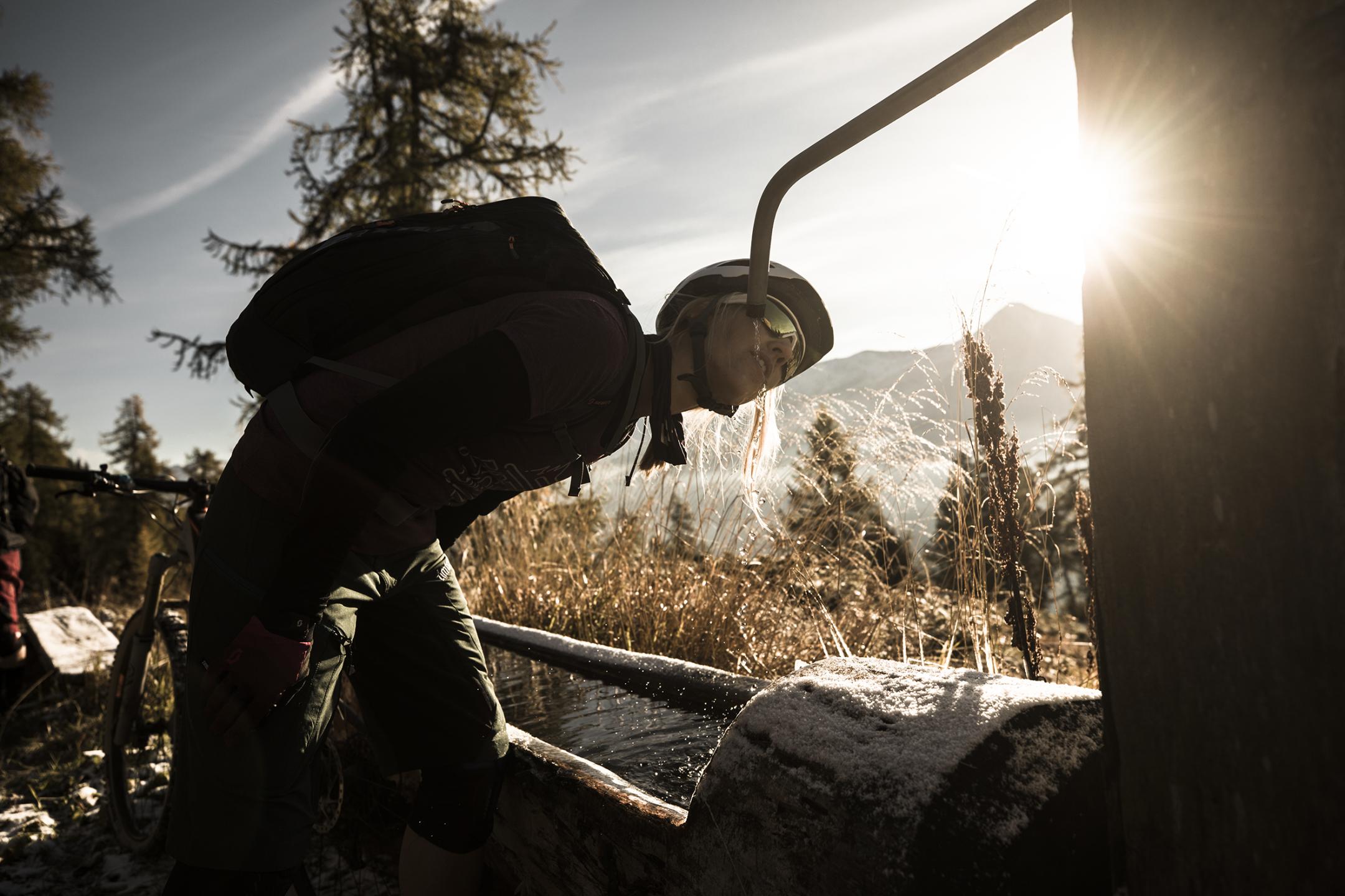 About halfway down we reached a hut with a friendly hunter, who invited us to make ourselves coffee. Gas stove, cups, coffee, Ovaltine, milk – we could use whatever we wanted. He couldn’t stay as he was just about to leave to track down dinner in the woods. For lunch we stopped in Binn, a charming village with houses in the original Valais style. The traditional wooden houses stand on wooden pillars topped with wide, flat stones, which stop rodents climbing up. We enjoyed a speciality of the region, «Cholera». A strange name for a dish they say originated in times of epidemic: no shopping required, the ingredients were in every larder. This vegetable pie, made with leeks, potatoes and cheese, lay heavy on our stomachs, but gave us the energy we needed for the rest of our ride.