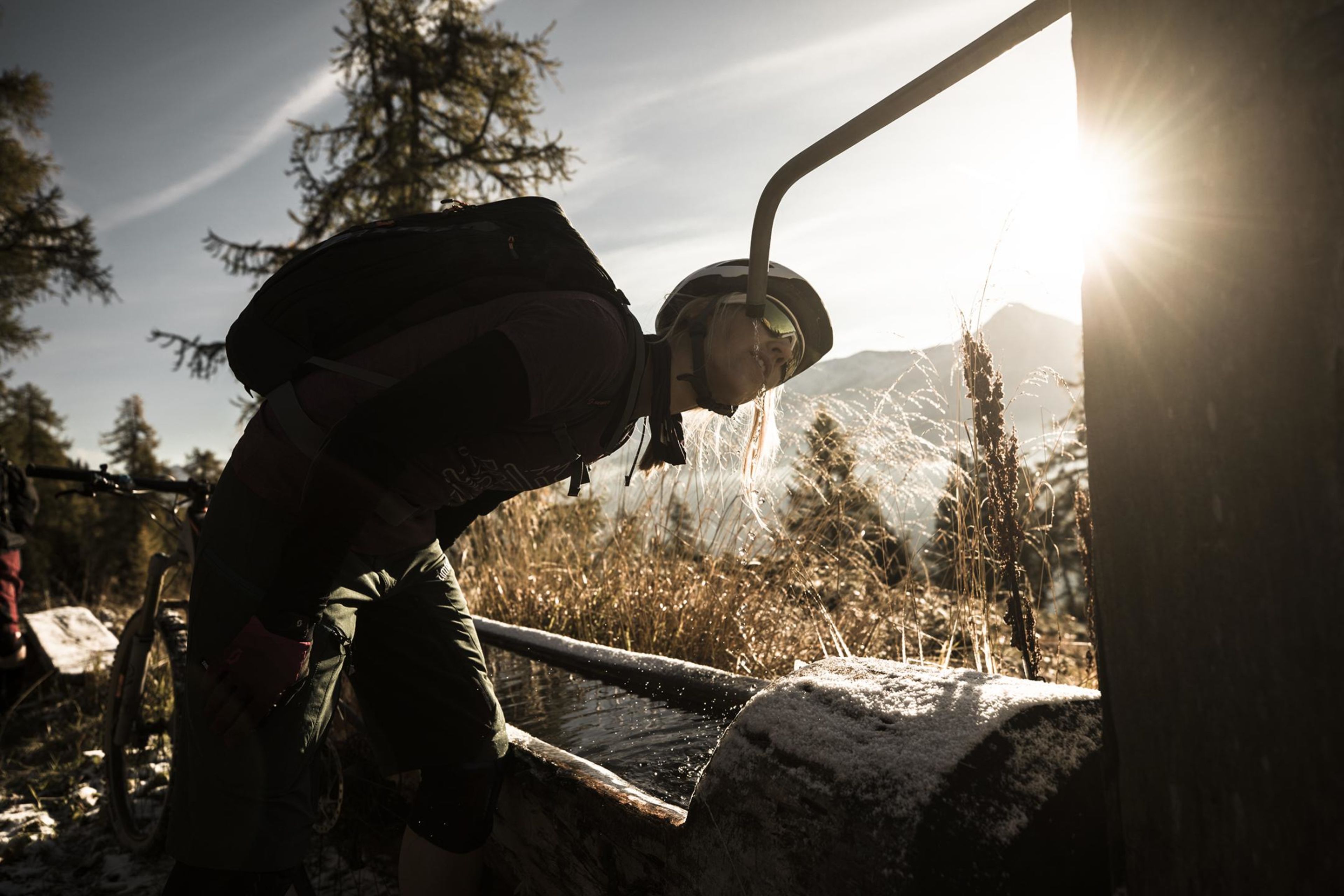 After a long day's cycling, with frost, sunshine, breathtaking views, rolling trails and a great atmosphere, we stop in Mühlebach for an after-bike break. Don't miss the suspension bridge over the Rhone linking Mühlebach to Fürgangen. This is where the manager of our next hotel picks us up to take us to his establishment.