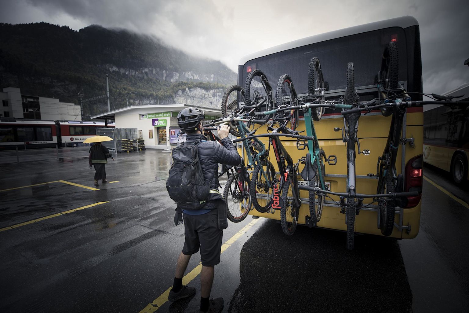 We had to change trains once in Lucerne before we got to Meiringen. We then continued our journey by public bus, known as PostBus in the Swiss mountains. Most are equipped with bike racks during the summer. Be aware these usually only have space for up to six bikes, so it’s worth reserving in advance to be sure. Romeo, founder and head guide at Rodeo Bike Co., did the trick for us.