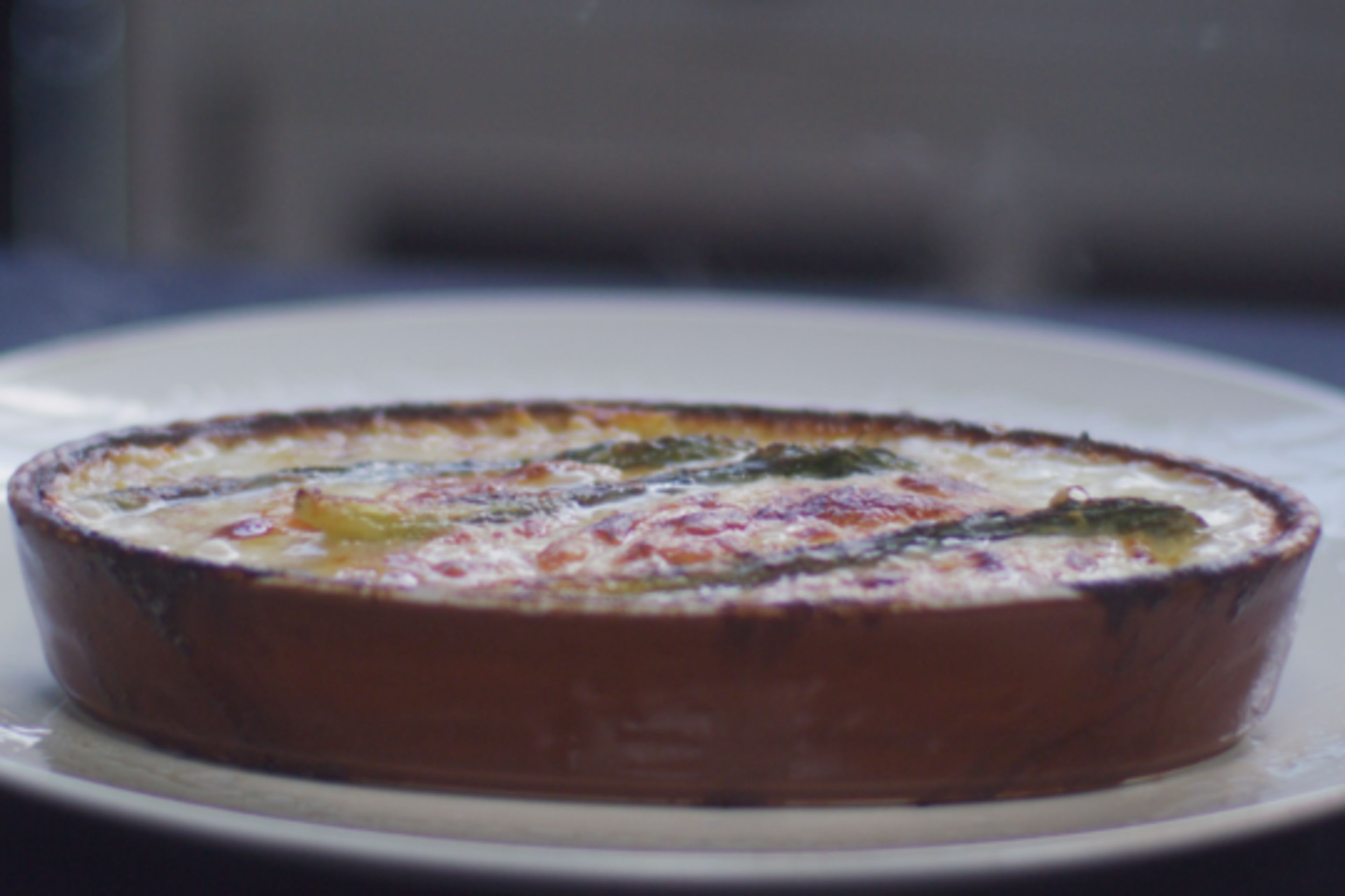 Add the vegetables to the mixture and pour into a gratin dish. Garnish with the tomatoes, cheese, and asparagus tips.