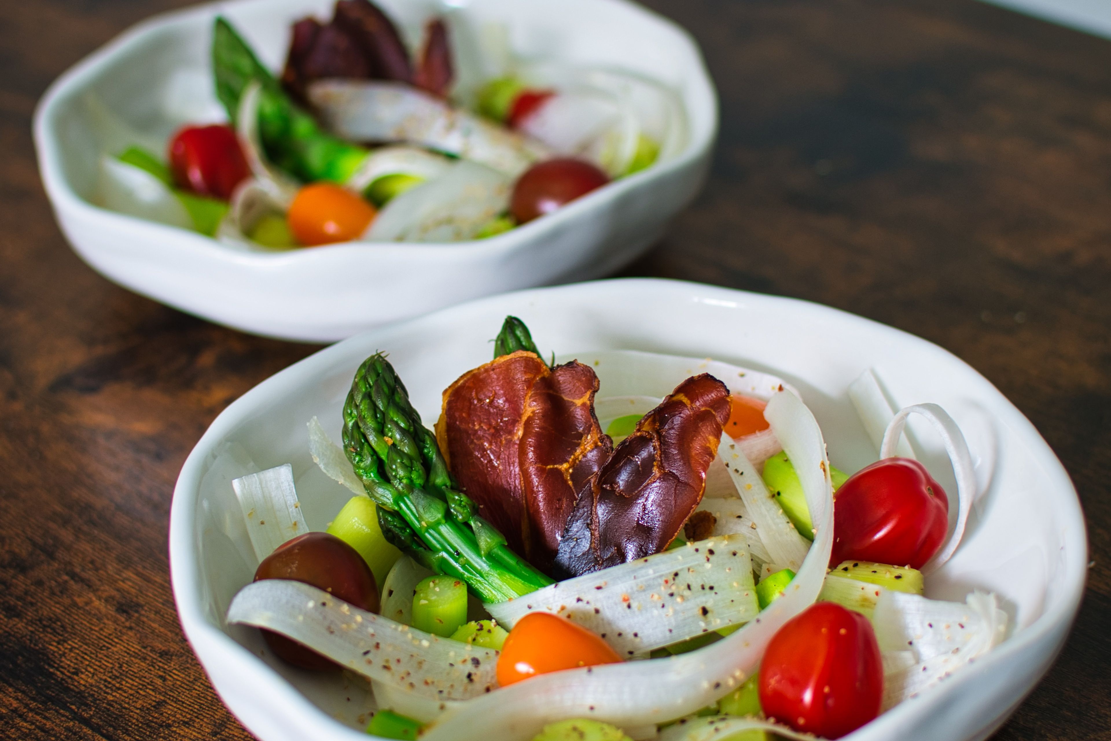 Mix everything with the sauce and serve with the asparagus tips pointing upwards.