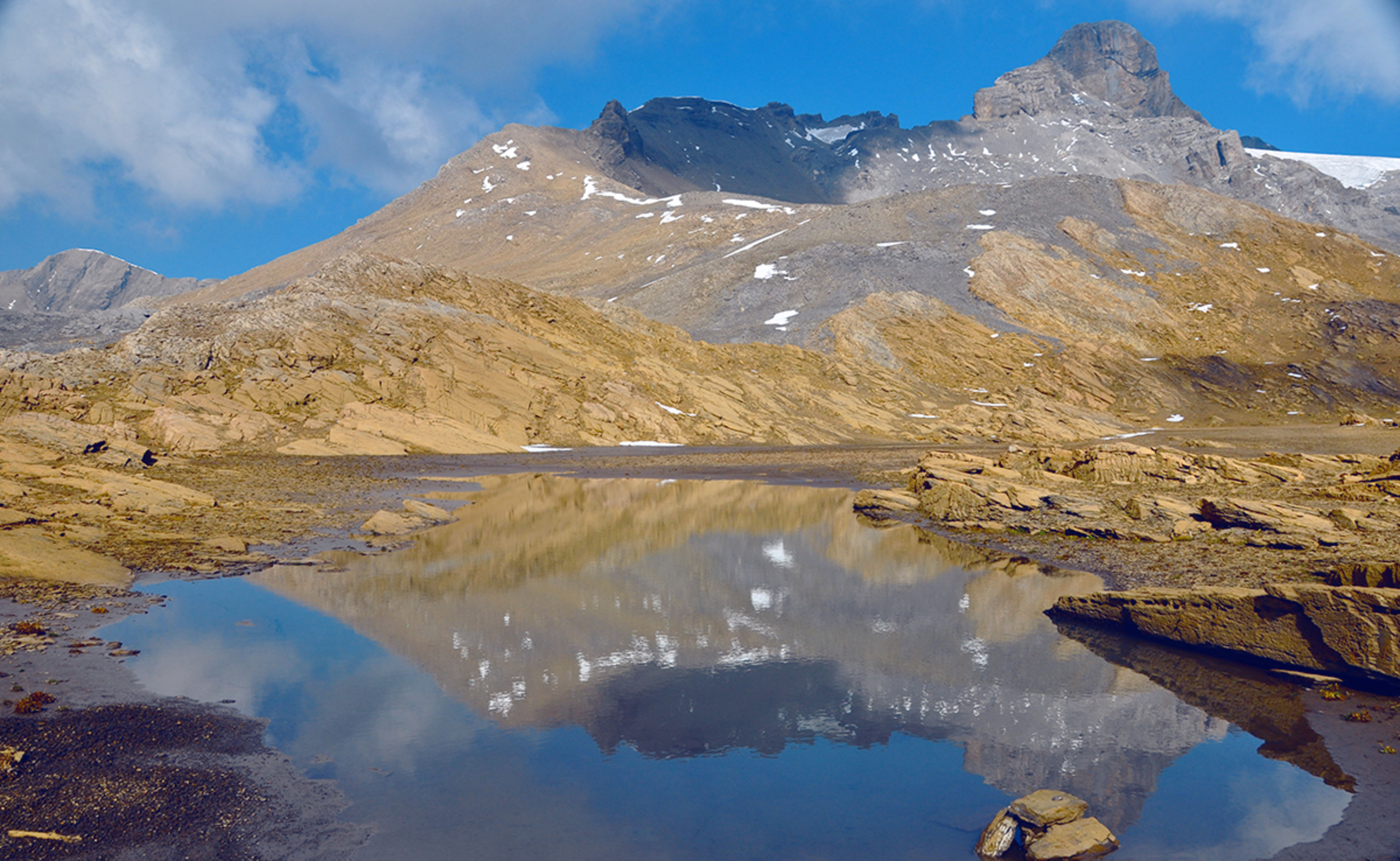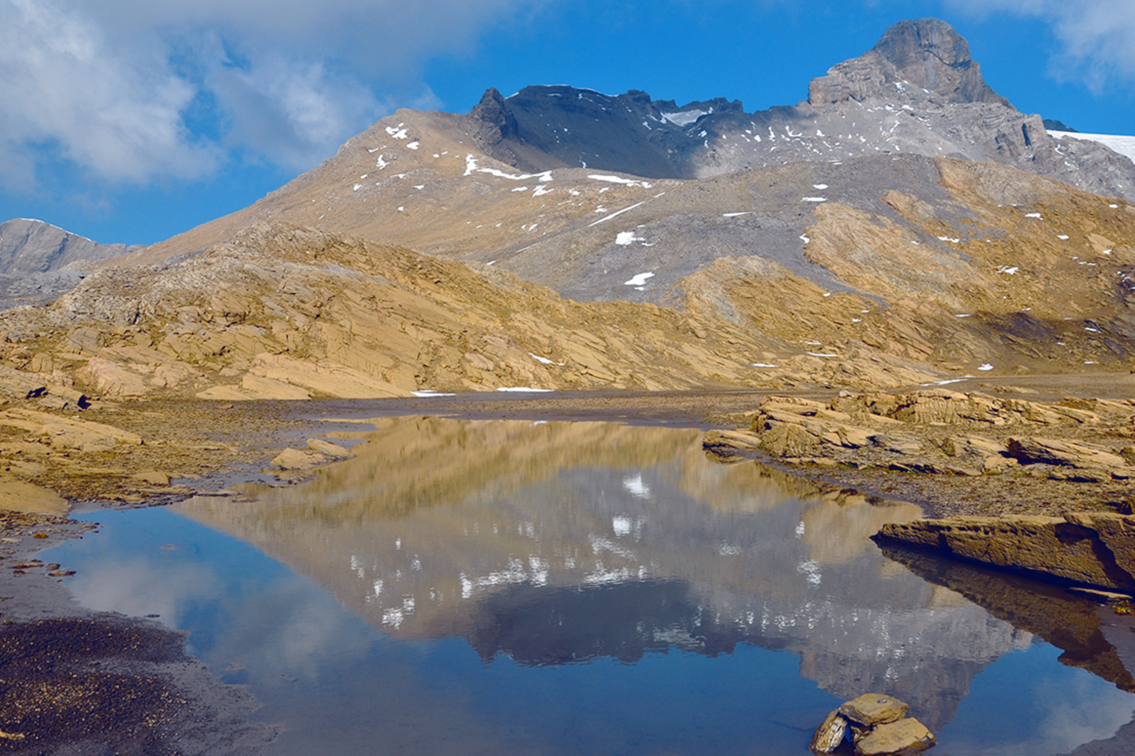 Cinq jours de traversée entre le Valais et Berne, cinq jours de vue spectaculaire sur les sommets verglacés du Wildhorn, cinq jours de nature pure. Le Tour du Wildhorn, c’est des journées de marche très variées et pleines de surprises: chemins taillés dans la falaise, montées raides dans des pentes d’éboulis, descente de quatre ou cinq échelles verticales, découverte de nombreux petits lacs de montagne, promenade au milieu des aconites et edelweiss, vue panoramique sur le glacier de la Plaine Morte, des Diablerets, du Mont-Blanc, le Grand Combin et les sommets entourant le Val d’Hérens et contemplation de multiples cascades qui descendent des parois vertigineuses.