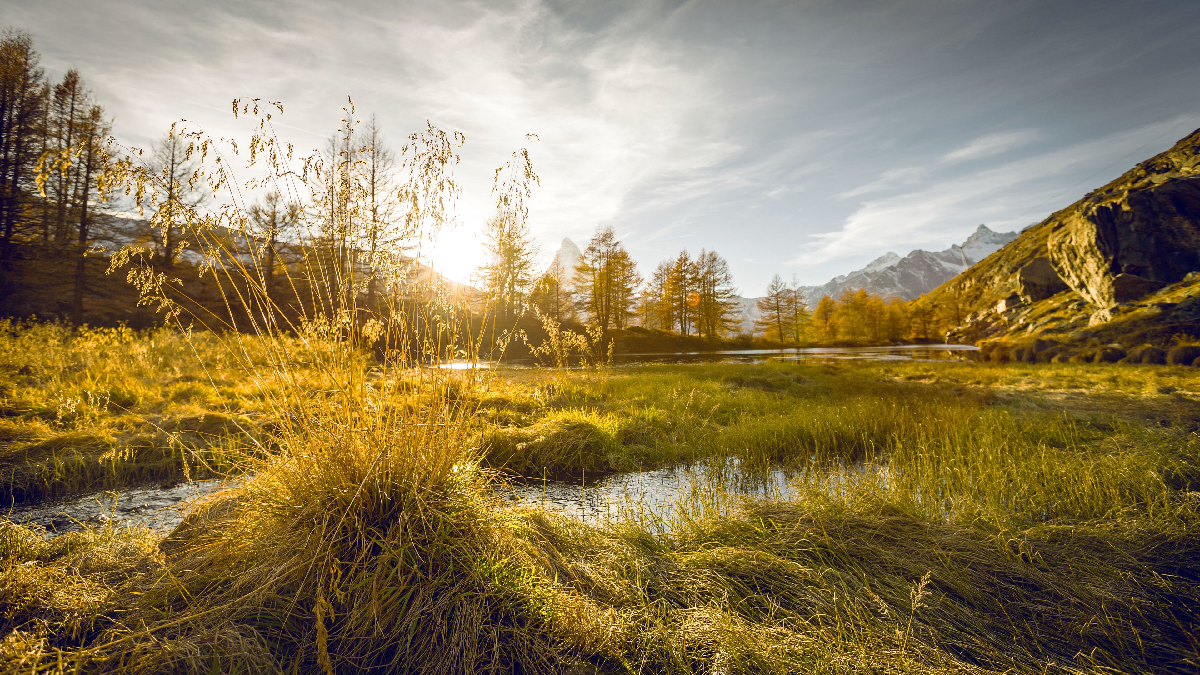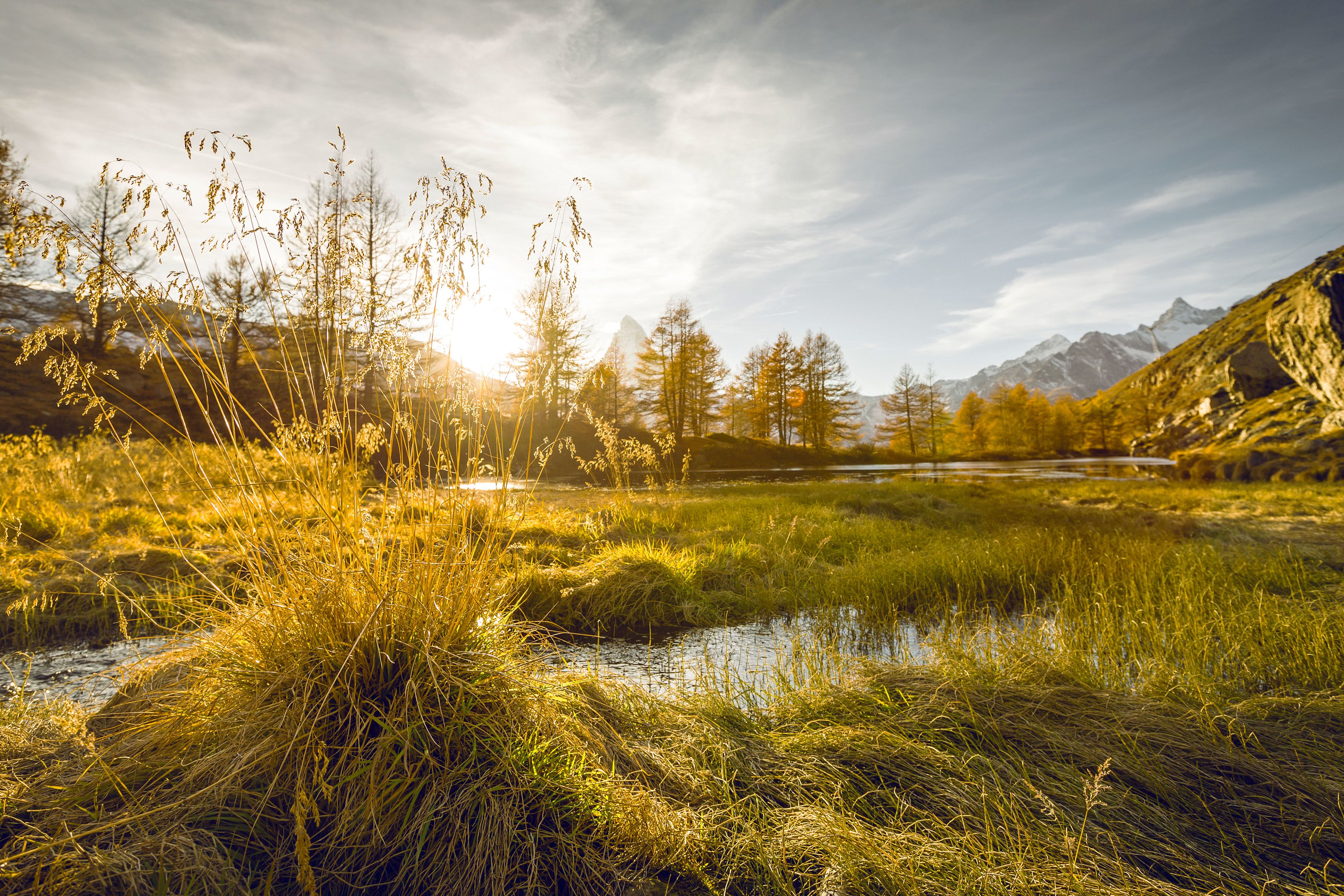 Le Grindjisee est un lac plein de secrets. Sur la surface paisible de l'eau se reflètent le Cervin ainsi que quelques mélèzes. Cette petite étendue d'eau charme par sa riche flore typique des haut-marais, qui ne se contente pas d'enthousiasmer les biologistes et les botanistes.