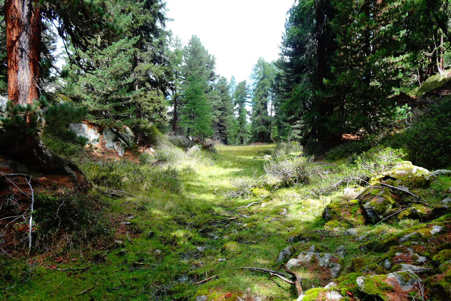 Nous n’en avons pas fini avec les passerelles. Le pont suspendu Aspi-Titter nous attend un peu plus loin. Mais, juste avant, le Chemin Panoramique d’Aletsch nous impressionne à sa manière. Quelle paix. Et cette odeur d’aroles, c’est fou. Nous montons vers la Riederfurka à travers la forêt d’Aletsch, encerclés par des arbres séculaires et ensorcelés par leur parfum. Alors que notre pouls battait la chamade sur le pont, il reprend peu à peu un rythme normal, malgré le dénivelé de la montée que nous effectuons tranquillement. Diego tente de photographier les arbres noueux ainsi que l’atmosphère extraordinaire de ce lieu. Quant à moi, j’inspire aussi profondément que je peux, pour remplir mes poumons de cet envoûtant parfum d’aroles et je ne peux m’empêcher d’en toucher un.