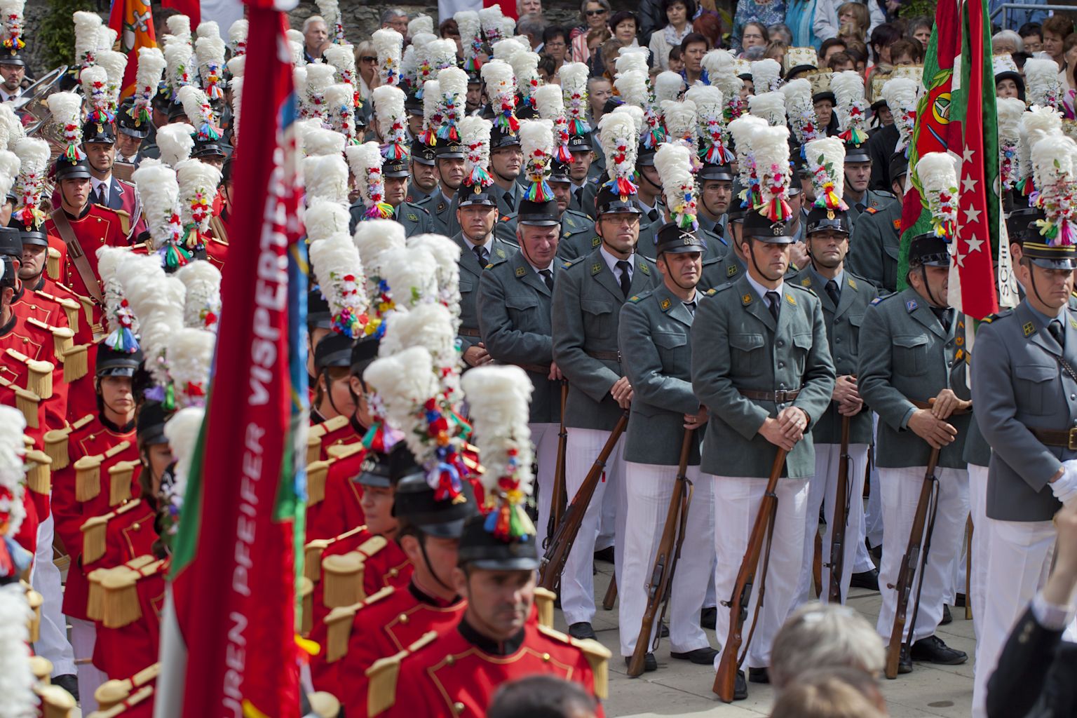 En Valais, certaines fêtes religieuses sont encore commémorées de manière traditionnelle, à l’image de la Fête-Dieu, célébrée le deuxième jeudi suivant la Pentecôte. Des processions défilent à la gloire de Dieu dans les communes de montagne et de plaine, à travers champs et campagnes. Accompagnée de grenadiers en uniformes des anciens régiments valaisans, la population en costume conduit le Christ dans l’ostensoir vers des autels décorés de couleurs vives, au son de marches processionnelles. Les offices de tourisme locaux et les communes fournissent des informations détaillées.