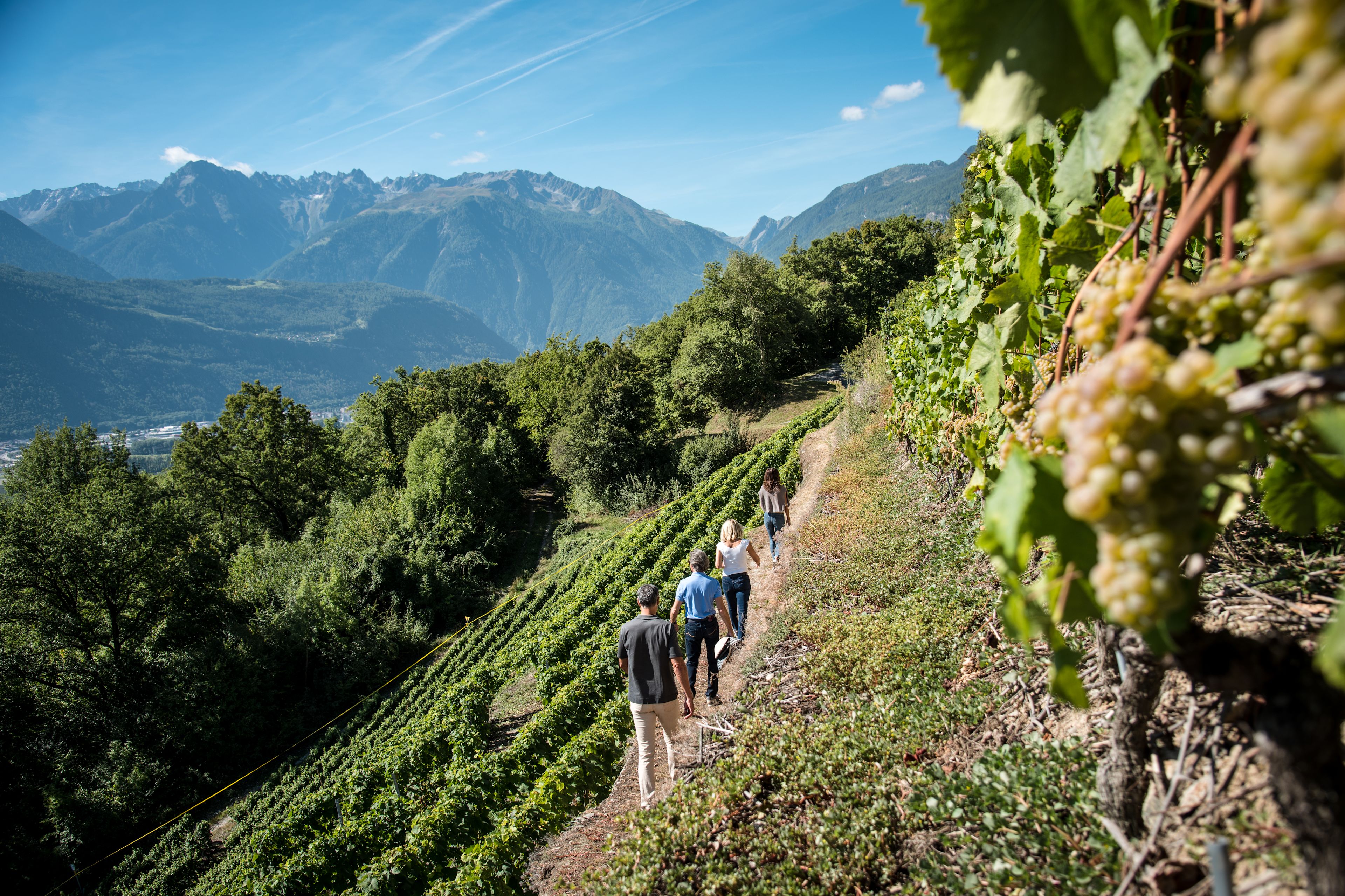 Randonnée guidée à travers les vignobles, dégustation de vins, repas (assiette valaisanne et raclette)