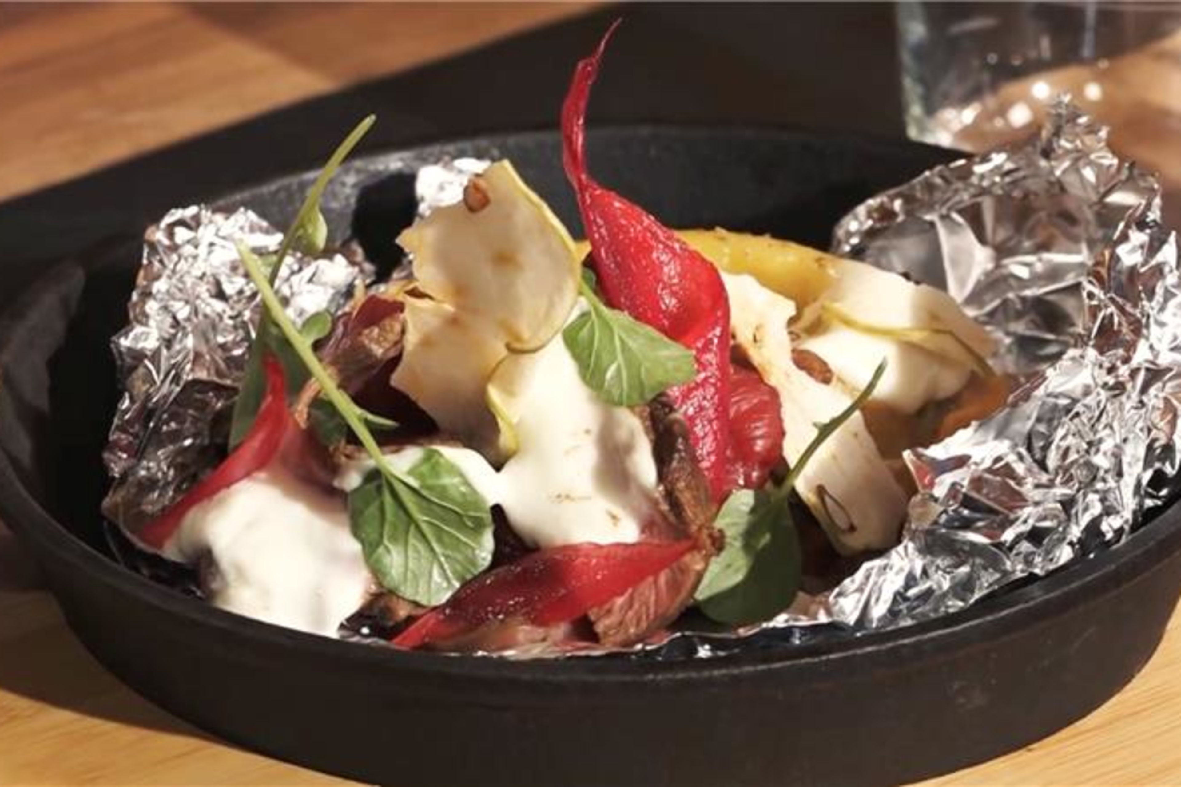 Ouvrir le papier d’alu des pommes de terre et déposer sur les bords de l’alu quelques tranches de viande puis garnir de sauce.